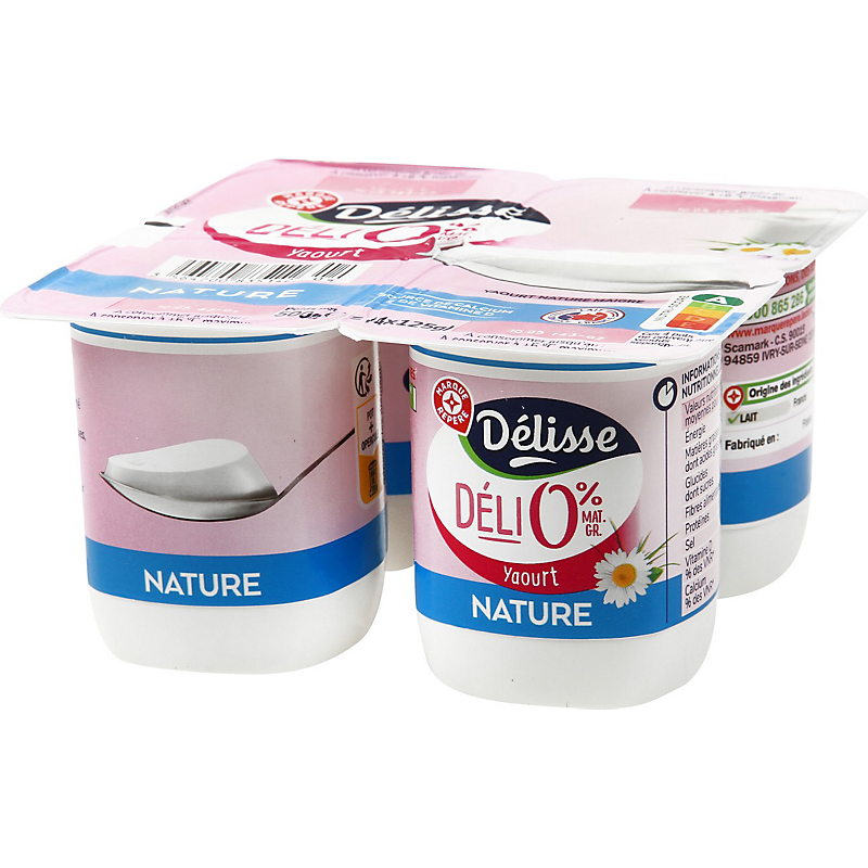 Déli'light yaourt nature étuvé 0% Mat. Gr. - 4 x 125 g - DELISSE
