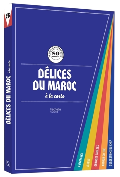 Ouvrez la carte de notre restaurant et laissez-vous tenter par nos spécialités. Choisissez votre menu parmi plus de 80 recettes pour toutes les circonstances : À partager : cocktail de thé vert à la menthe, mélange de fruits secs, briouats au boeuf, caviar d'aubergine, etc. À deux : salade méchouia, soupe de fèves, brochettes de kefta à l'agneau, couscous au poulet safrané, tajine de poulet aux pruneaux, salade d'orange à la cannelle etc. Grandes tablées : pastilla de poulet au citron confit, chorba d'agneau, maftoul aux haricots rouges, tajine d'agneau à l'orange, couscous sucré aux fruits secs etc. Autour du thé : lait d'amandes, makrouts aux dattes, baklavas aux amandes, cornes de gazelle, etc. Faites votre choix ! Et pour les plus indécis, découvrez les suggestions du chef : menu végétarien, sucré-salé, spécial poisson, léger, économique etc. Le livre-menu idéal pour recevoir à la maison comme dans un restaurant typiquement marocain !