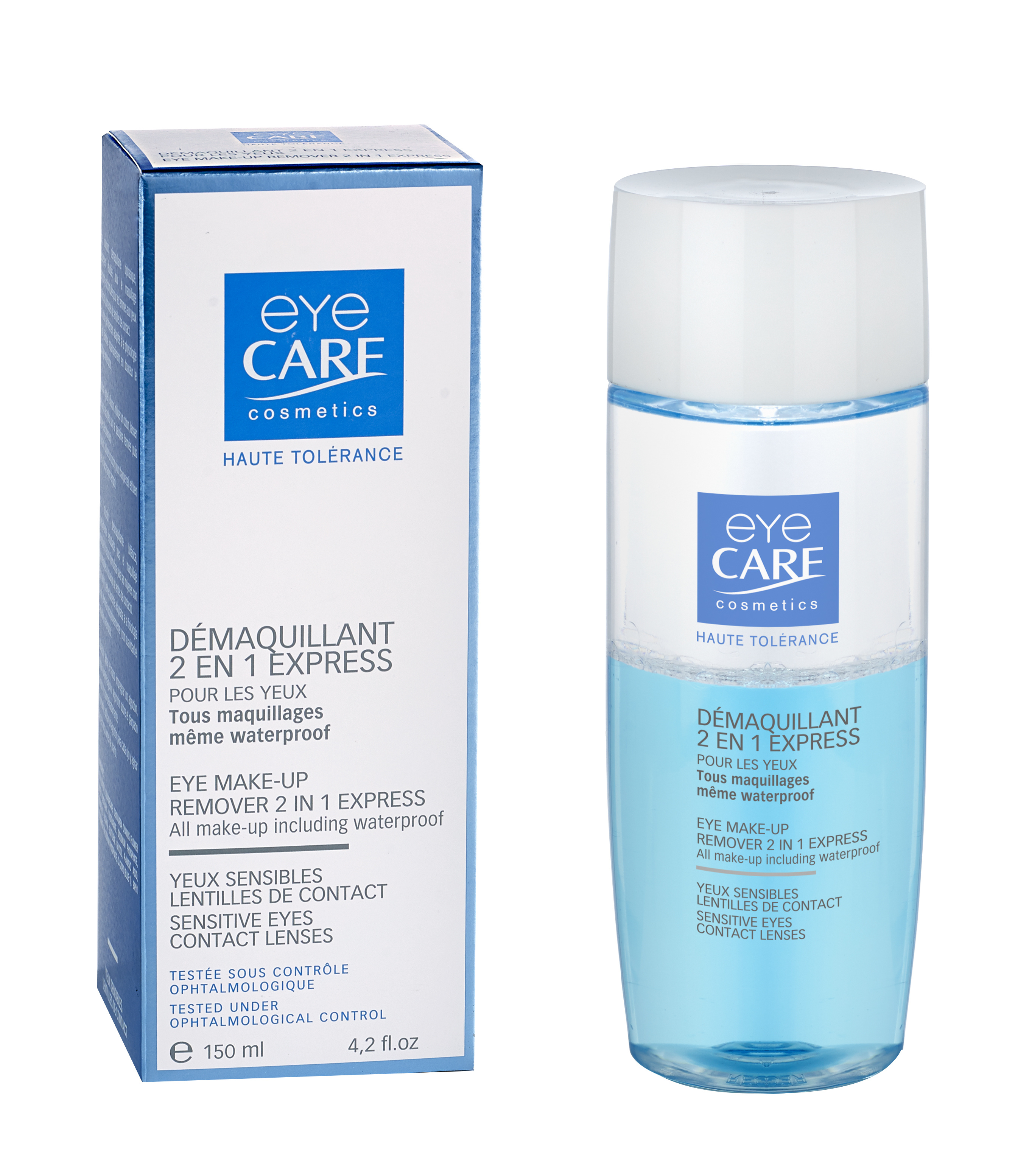 Eye Care Démaquillant 2 en 1 Express 150 ml est une solution démaquillante biphasique, spécialement étudiée pour le maquillage waterproof. Cette solution est formulée pour les femmes aux yeux sensibles ou porteuses de lentilles de contact. Elle est parfaitement adaptée à la physiologie de l'oeil et élimine instantanément le maquillage waterproof. Testée sous contrôle ophtalmologique.