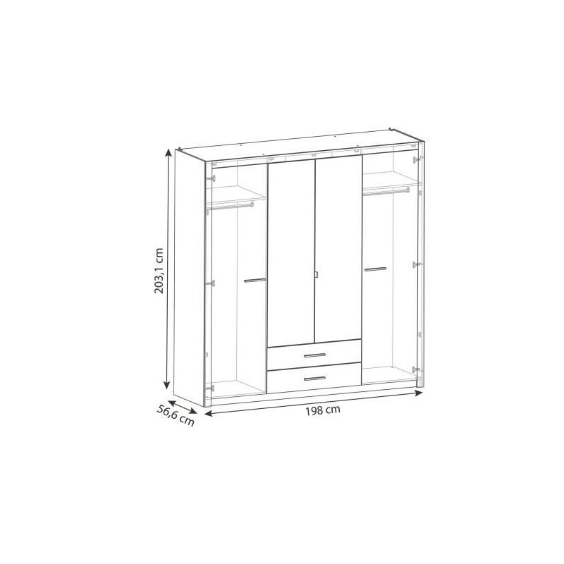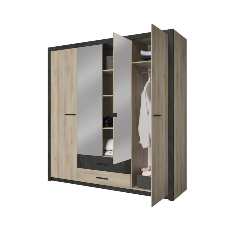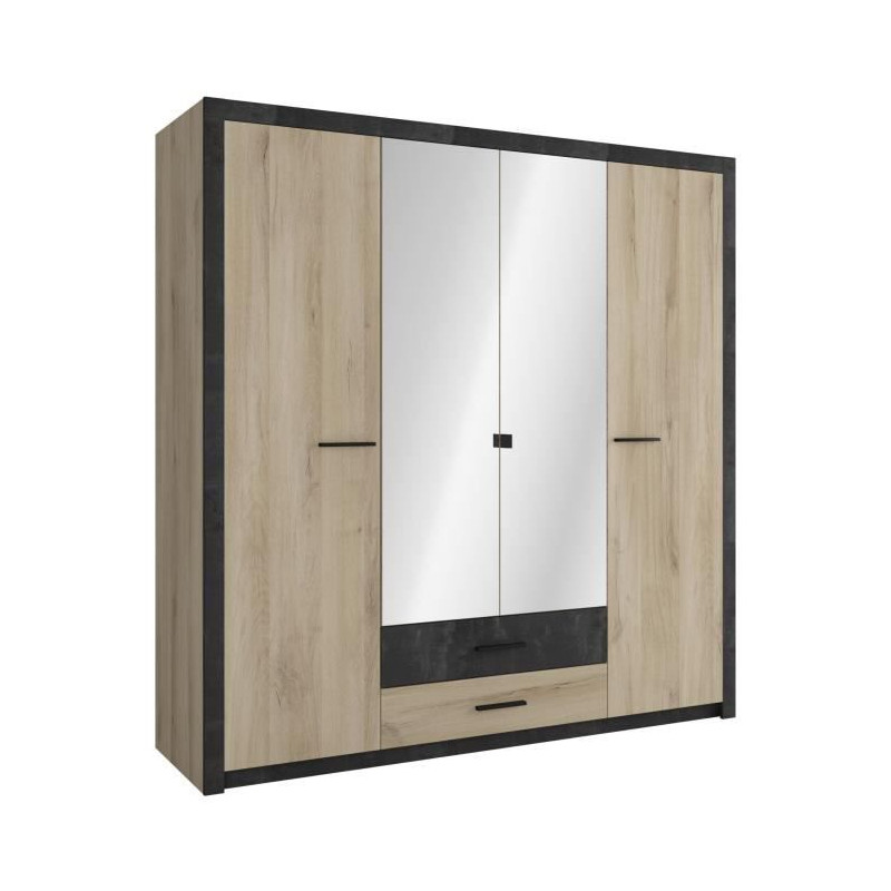 COLORADO Armoire 4 PO / 2 T Chene Kronberg / Sidewalk de dimesions L 198 x H 203,1 x 56,6 cm. Epaisseur 15 mm. Montants MDF enrobé. 2 miroirs a bords rodés 3 mm / H 1519 mm x L 419 mm. Coulisses a bille métal 17 mm. Chants droits. Charniere métal D 26 mm. Tiroir hauteur de 120 mm. Raidisseur métal de tiroir