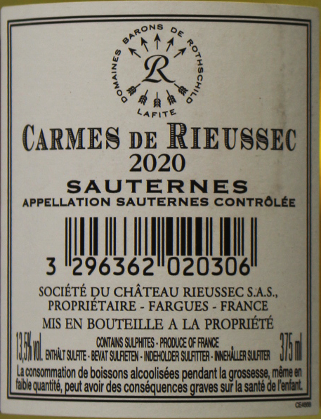 | Libellé | Demi-bouteille Carmes de Rieussec, 2020 - Sauternes AOP - Blanc Moelleux - 37.5 cl |