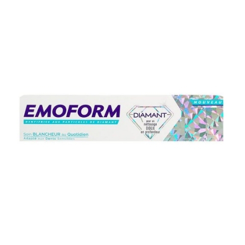 Emoform Diamant Dentifrice Soin Blancheur 75 ml est un dentifrice qui favorise l'élimination des taches et évite la formation de la plaque dentaire tout en respectant l'émail des dents. Ce dentifrice restaure en douceur la blancheur naturelle de l'émail et rend les dents lisses et brillantes. Sa formule est particulièrement adaptée aux dents sensibles. Enrichie en fluorure, sa formule aide à protéger et à renforcer l'émail des dents et prévient aussi la formation des caries.