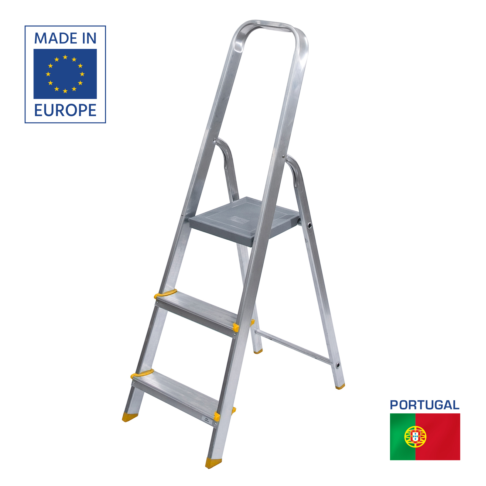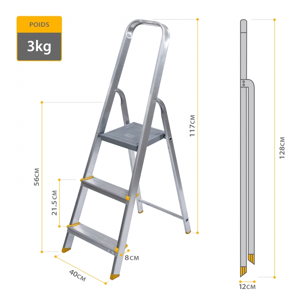 L'escabeau 3 marches DENZEL est conçu pour répondre à tous vos besoins et vous supporter au mieux dans vos travaux de bricolage, rénovation… Sa conception de qualité, étudiée et testée conviendra aussi bien aux particuliers qu'aux professionnels.Maniable et léger Léger et compact, le modèle 3 marches permet d'être déplacé, utilisé et rangé facilement sans prendre de place, par n'importe qui. Il ne nécessite pas de compétences particulières, et sera notamment pratique pour travailler à la maison en intérieur : changer une ampoule, fixer un luminaire, monter une armoire, etc.Léger mais pas moins résistantCet escabeau est fabriqué en aluminium, bien qu'il soit léger, ce matériau assure une résistance à toute épreuve et confère une résistance à la charge jusqu'à 150 kg ! Pratique pour pouvoir l'utiliser avec tous vos équipements que ce soit des outils, divers matériaux... Sécurité avant tout !Le développement de cet escabeau à été largement tourné vers la sécurité, selon nous primordiale pour ce genre de produit : il dispose de patins anti-dérapants, rainurés, asurant une grande stabilité sur tous types de revêtements (carrrelage, parquet, béton...). Ainsi vous pourrez monter sans crainte dé dérapage. les marches de l'escabeau sont nervurées, elles permettent ainsi à la semelle de vos chaussures de "s'agripper" et maintenir fermement votre pied. Chaque rivets et vis sont vérifiés minutieusement avant la mise en circulation sur le marché L'épaisseur des divers profilés métalliques (montants, échelons...) est vérifiée au millimètre près pour garantir une qualité accrue. Informations techniques :- Dimensions reployé : 128 x 40 x 12 cm- Hauteur déployé : 117 cm- Hauteur de plateforme : 56 cm- Profondeur des marches : 8 cm- Poids : 3 kg