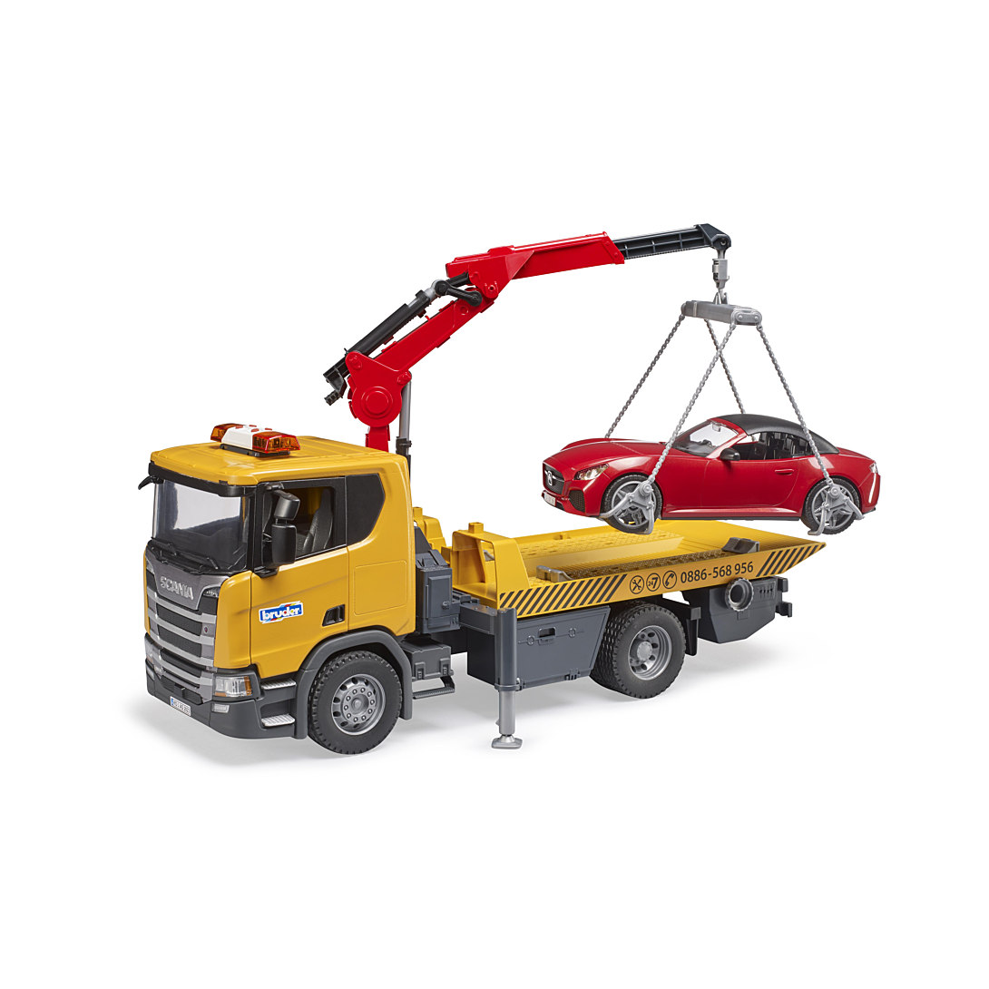 Dépanneuse Scania Super 560R avec module son et lumière et véhicule Bruder Roadster.