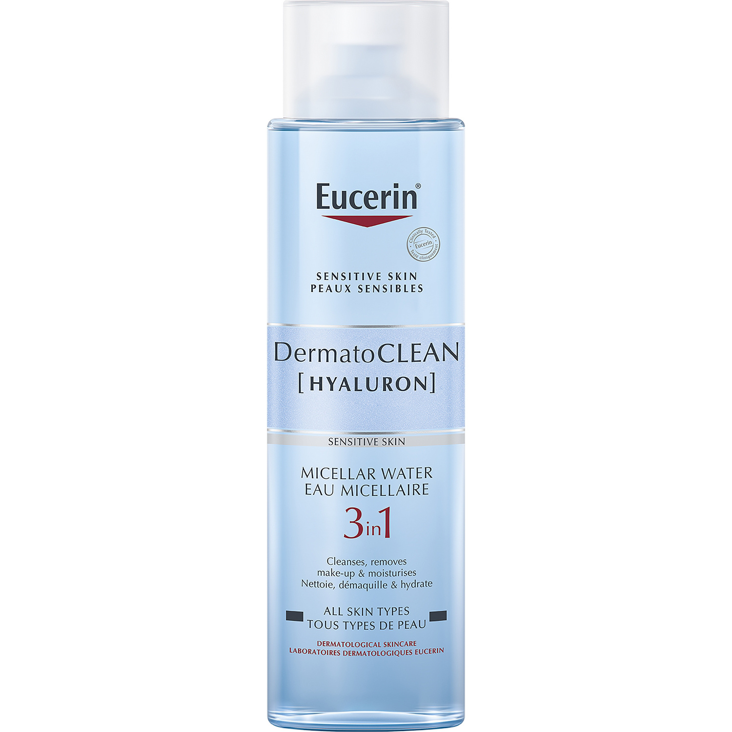 Eucerin DermatoCLEAN [HYALURON] Eau Micellaire 3 en 1 – 400 ml est un nettoyant pour le visage doux et efficace. Il nettoie intensément et en douceur, enlève les impuretés, le sébum, démaquille le visage et les yeux. Sa formule, avec de l'Acide Hyaluronique et d'autres ingrédients hydratants (Complexe APG) ne dessèche pas la peau.