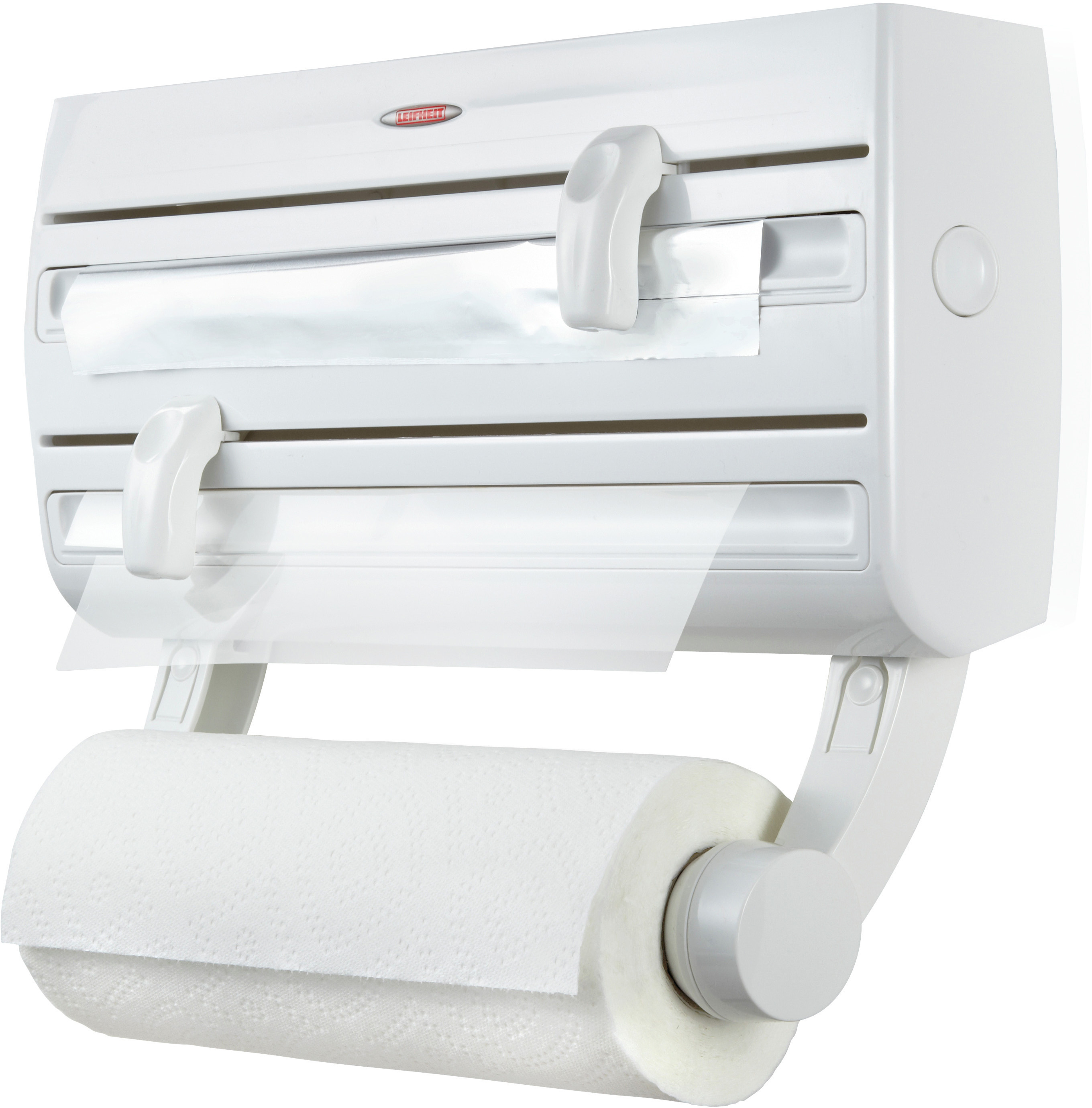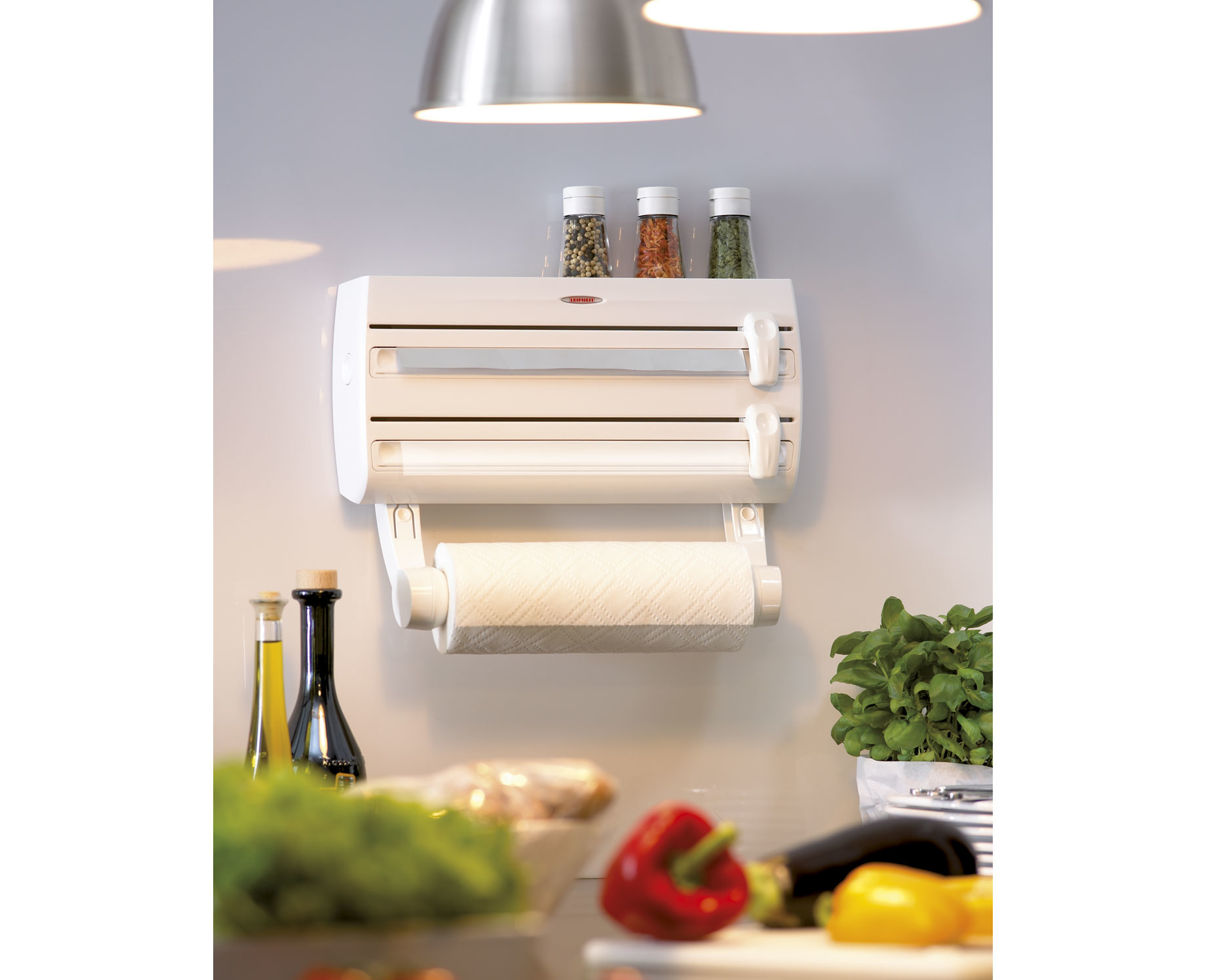 Modèle : Blanc (existe également en Noir et en Rouge) Support pour essuie-tout amovible et ajustable : peut être utilisé avec ou sans Zone de rangement sur le dessus : pratique pour ranger des épices, etc... 2 curseurs inox Chevilles et vis fournies Garantie 3 ans.