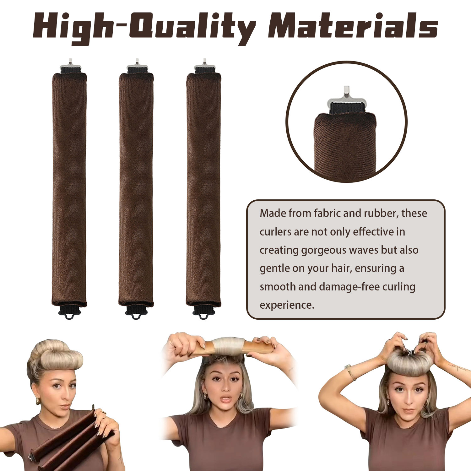 Matériaux de haute qualité : Cet outil de coiffure est fait de tissu lisse à l'extérieur et de caoutchouc souple à l'intérieur. Il est à la fois doux et agréable à porter dans les cheveux.
