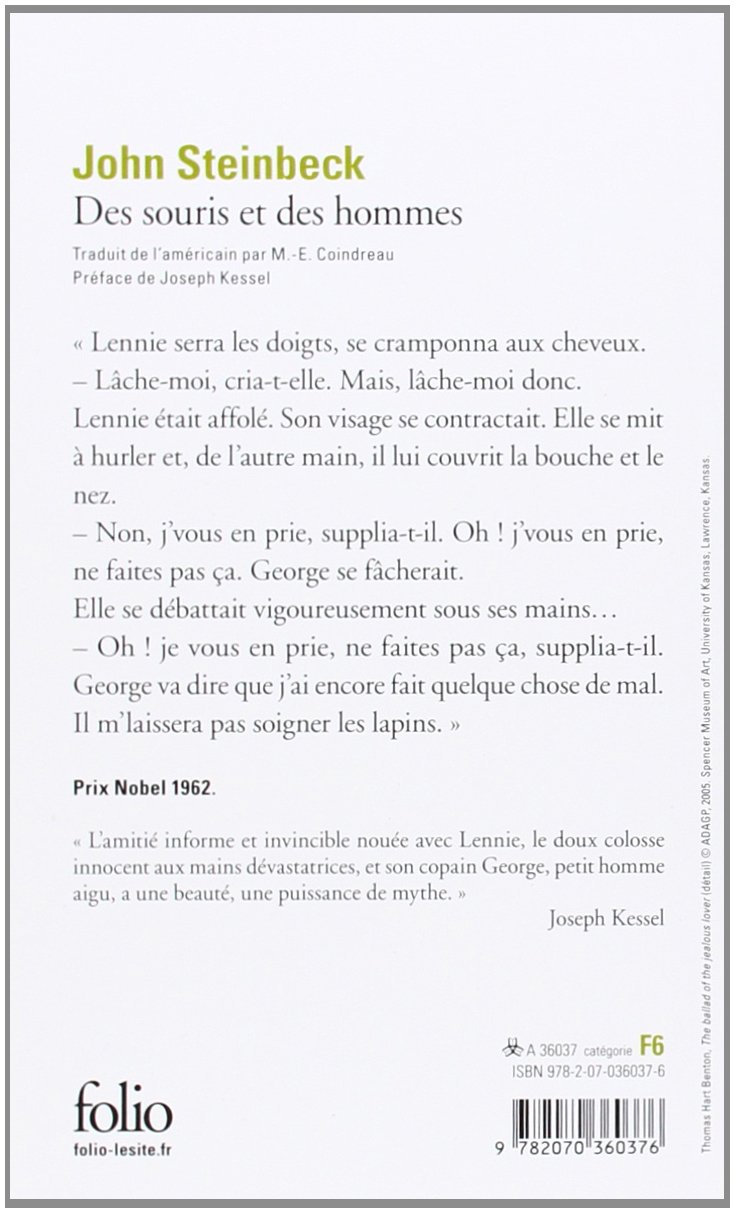 «L'amitié informe et invincible nouée entre Lennie, le doux colosse innocent aux mains dévastatrices, et son copain George, petit homme aigu, a une beauté, une puissance de mythe» (joseph Kessel).