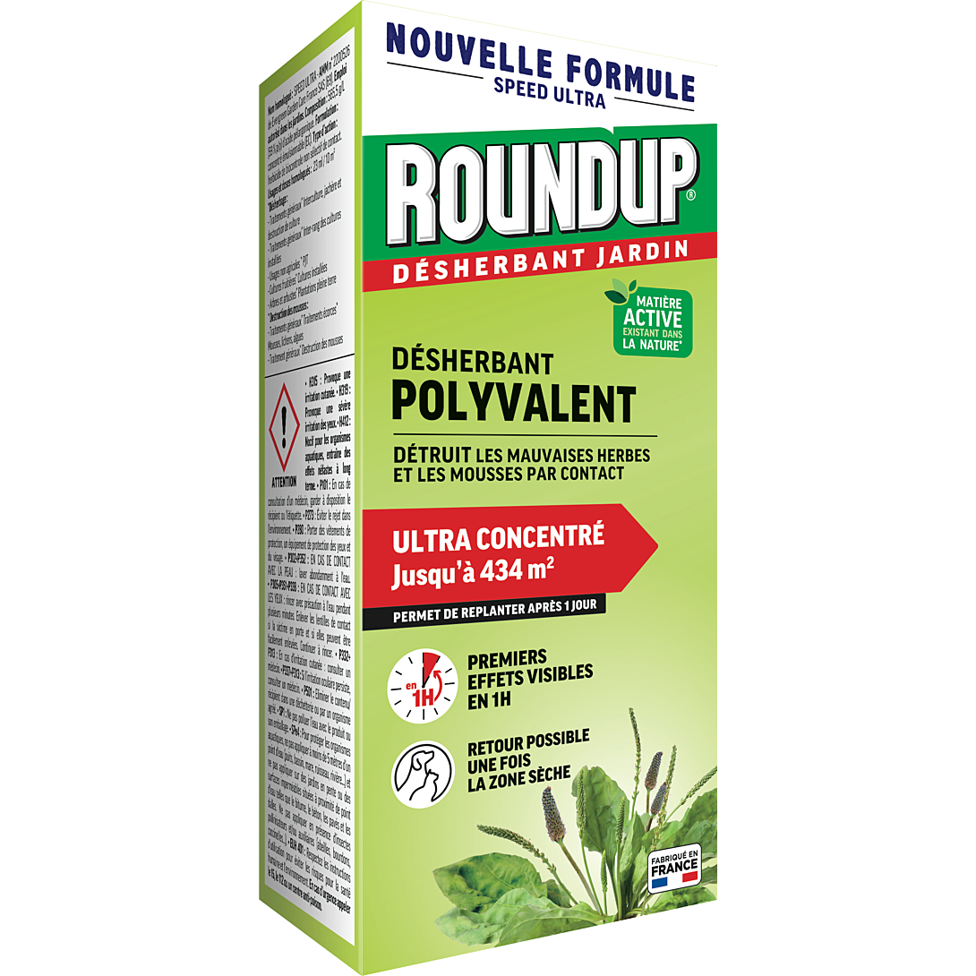 Idéal pour les grandes surfaces, le désherbant Roundup Multi-usages 1L à base d'acide pélargonique (565 g/l) élimine très rapidement les mauvaises herbes par simple contact aussi bien dans le jardin que sur les cours, allées, terrasses gravillonnées. Il est aussi efficace sur les mousses. Très rapide, les premiers effets sont visibles en 1H. Pratique en bouteille auto-doseuse, il permet de replanter ou semer après 1 jour seulement. Formule liquide ultra concentrée.