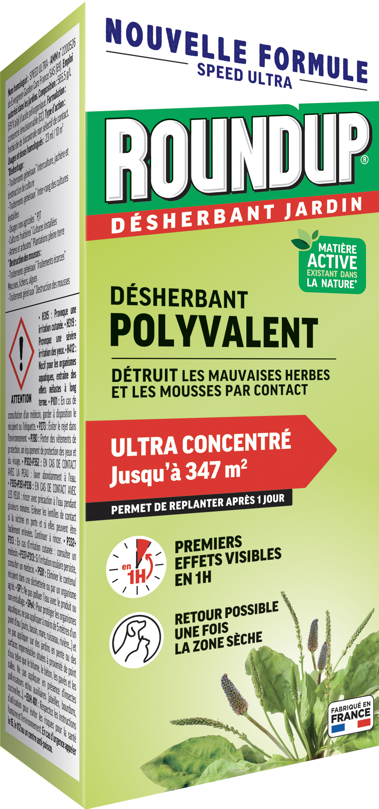Idéal pour les grandes surfaces, le désherbant Roundup Multi-usages 800mL à base d'acide pélargonique (565 g/l) élimine très rapidement les mauvaises herbes par simple contact aussi bien dans le jardin que sur les cours, allées, terrasses gravillonnées. Il est aussi efficace sur les mousses. Très rapide, les premiers effets sont visibles en 1H. Pratique en bouteille auto-doseuse, il permet de replanter ou semer après 1 jour seulement. Formule liquide ultra concentrée.