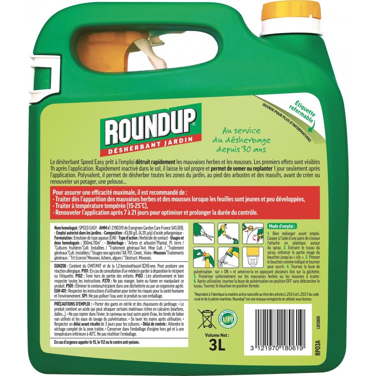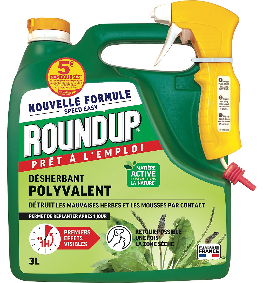 Le désherbant Roundup® prêt à l'emploi 3 L détruit rapidement les mauvaises herbes. Les premiers effets sont visibles 1 h après l'application. Rapidement inactivé dans le sol, il laisse le sol propre et permet de semer ou replanter 1 jour seulement après l'application. Polyvalent, il permet de désherber dans toutes les zones du jardin, au pied des arbustes et des massifs, avant de créer ou renouveler un potager, une pelouse... > 1er effets visibles très rapides « 1 heure suffit » ! > Prêt à l’emploi « aucune préparation nécessaire ». > Sa formule exclusive permet avec 3 litres seulement de désherber jusqu'à 100 m².