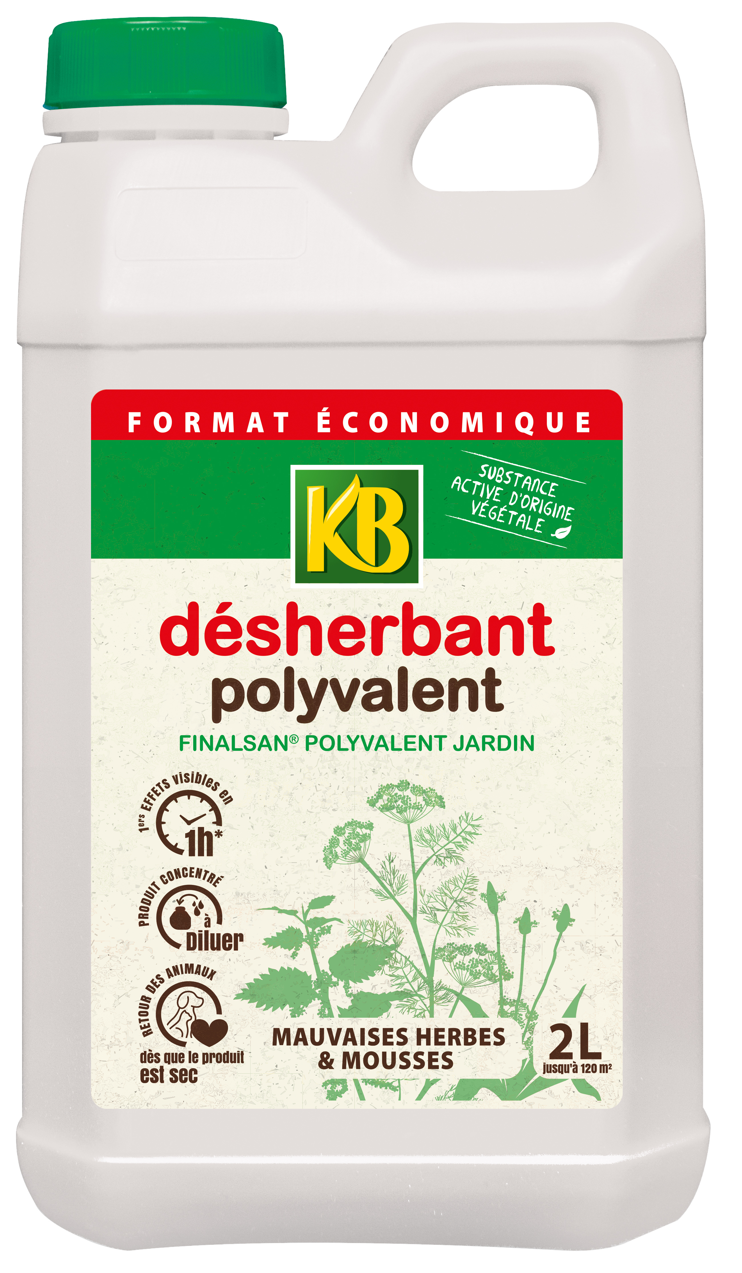 Le désherbant polyvalent KB s’utilise aussi bien dans le jardin que sur les cours, allées, chemins et terrasses. A base d’acide pélargonique, une matière active présente dans la nature, il détruit rapidement les mauvaises herbes par simple contact. Les premiers effets sont visibles en 1 h. En bouteille avec bouchon doseur intégré, il permet de limiter le contact avec le produit. KB désherbant Finalsan Polyvalent Jardin, c'est la marque référente du désherbage à petit prix ! Format économique idéal jusqu'à 120m².