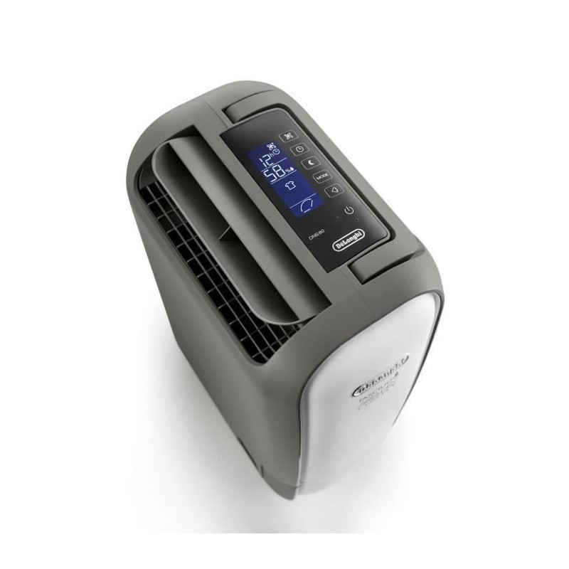 dns80 - déshumidificateur 7.5l/j 45m² - Déshumidificateur DeLonghi DNS80 avec capteur de réservoir plein : s?arrête automatiquement quand le réservoir est plein.SEULEMENT 34 db : Un niveau sonore réduit grâce à une technologie sans compresseur.NOUVEL ÉCRAN LCD : Nouvel écran LCD, conçu pour fournir un confort et une simplicité d?utilisation au quotidien.TECHNOLOGIE IONISEUR : La fonction Ioniseur produit un nuage d?ions négatifs dans la pièce qui permet de purifier l?air et d?améliorer le bien-être au quotidien.TECHNOLOGIE ZEOLITE : La technologie zéolite repose sur les propriétés du minéral volcanique du même nom dont la composition permet d?absorber l?humidité. Des billes de zéolite sont placées dans l?appareil pour augmenter son efficacité.