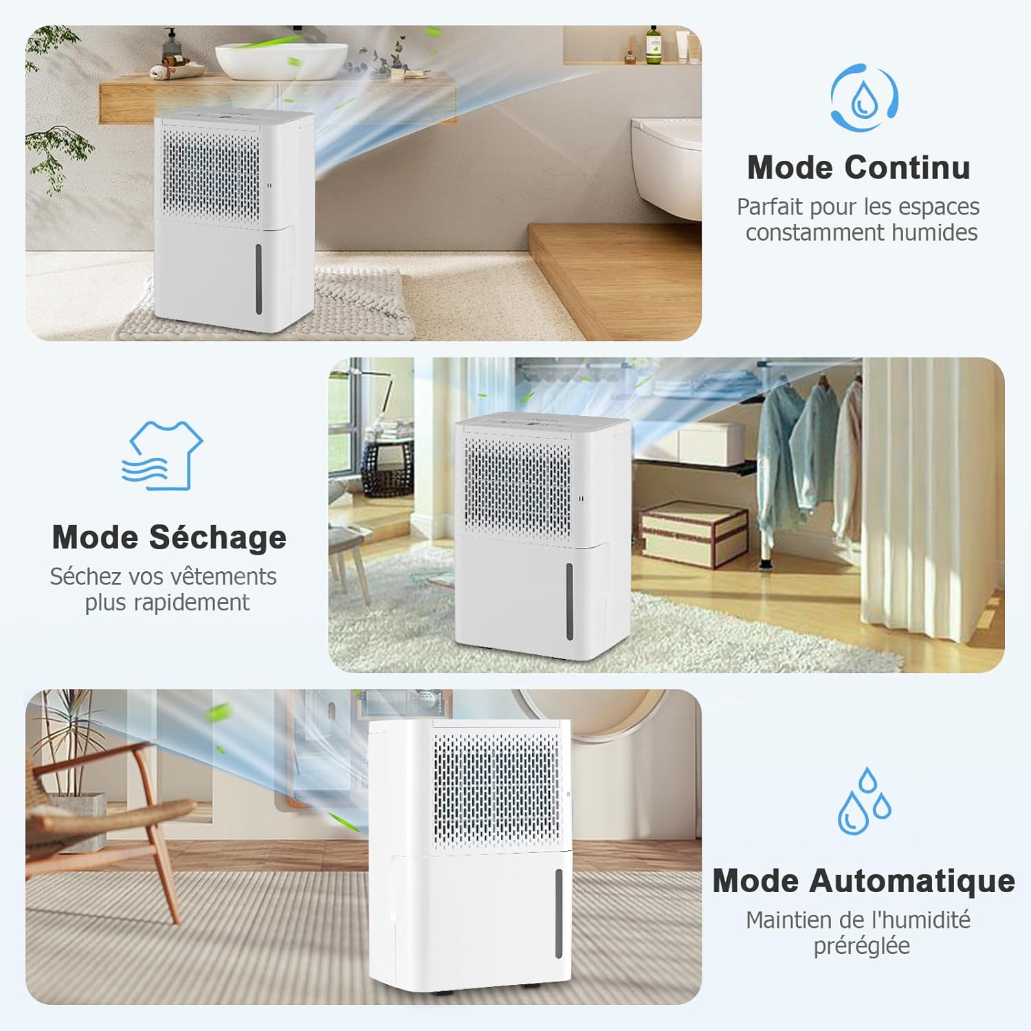 3 modes de déshumidification pour répondre à différents besoins