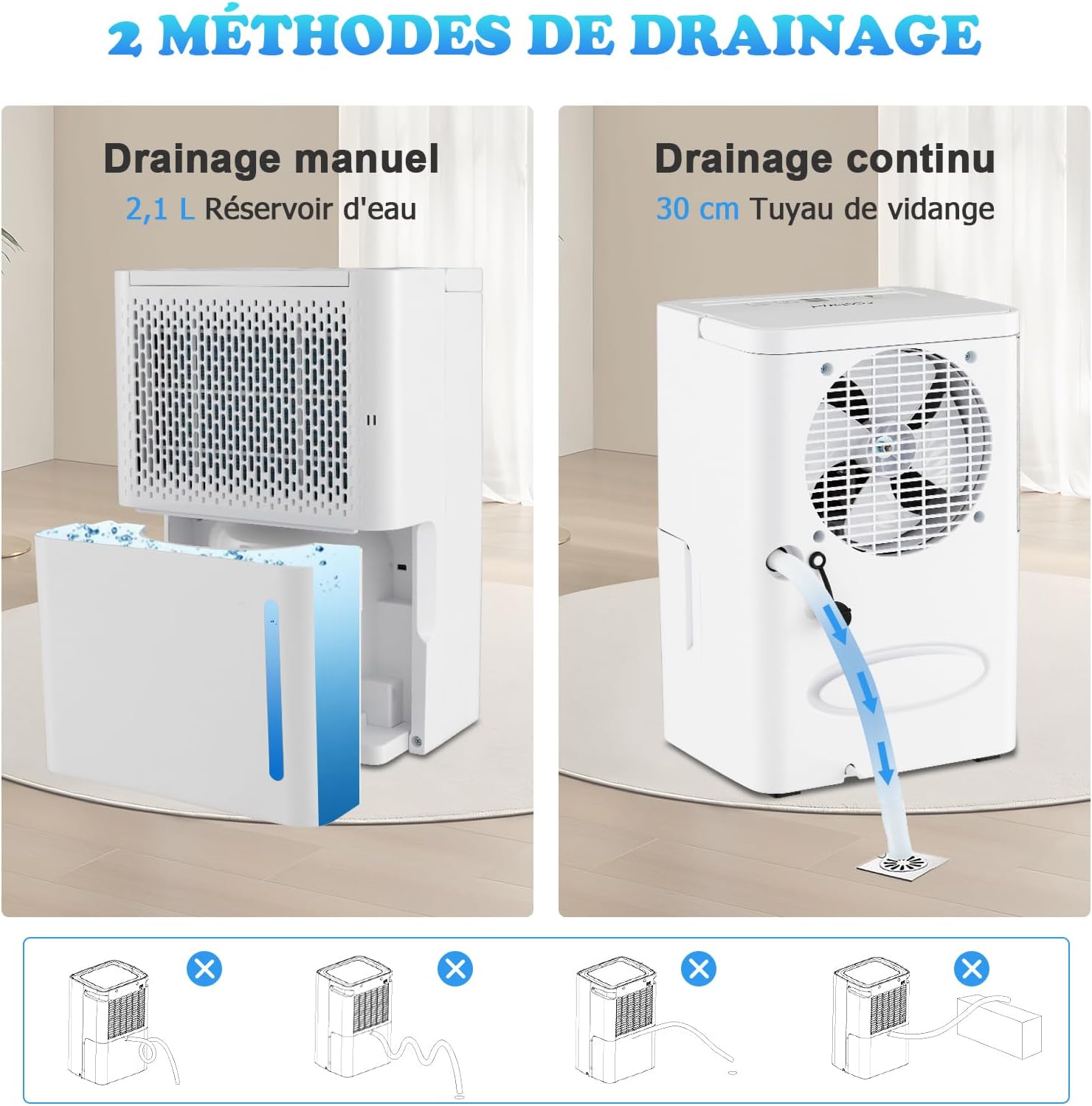 • Drainage Flexible : Il existe 2 méthodes de drainage : le drainage manuel (en vidant le réservoir d'eau de 2,1 L) ou le drainage continu (en raccordant le tuyau de vidange de 30 cm fourni). En outre, le filtre peut être retiré et nettoyé pour faciliter l'entretien. La poignée supérieure permet de déplacer facilement le déshumidificateur.