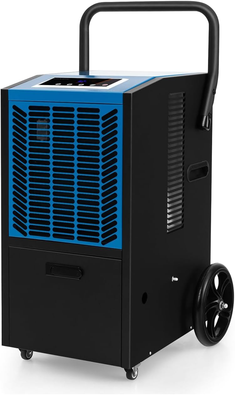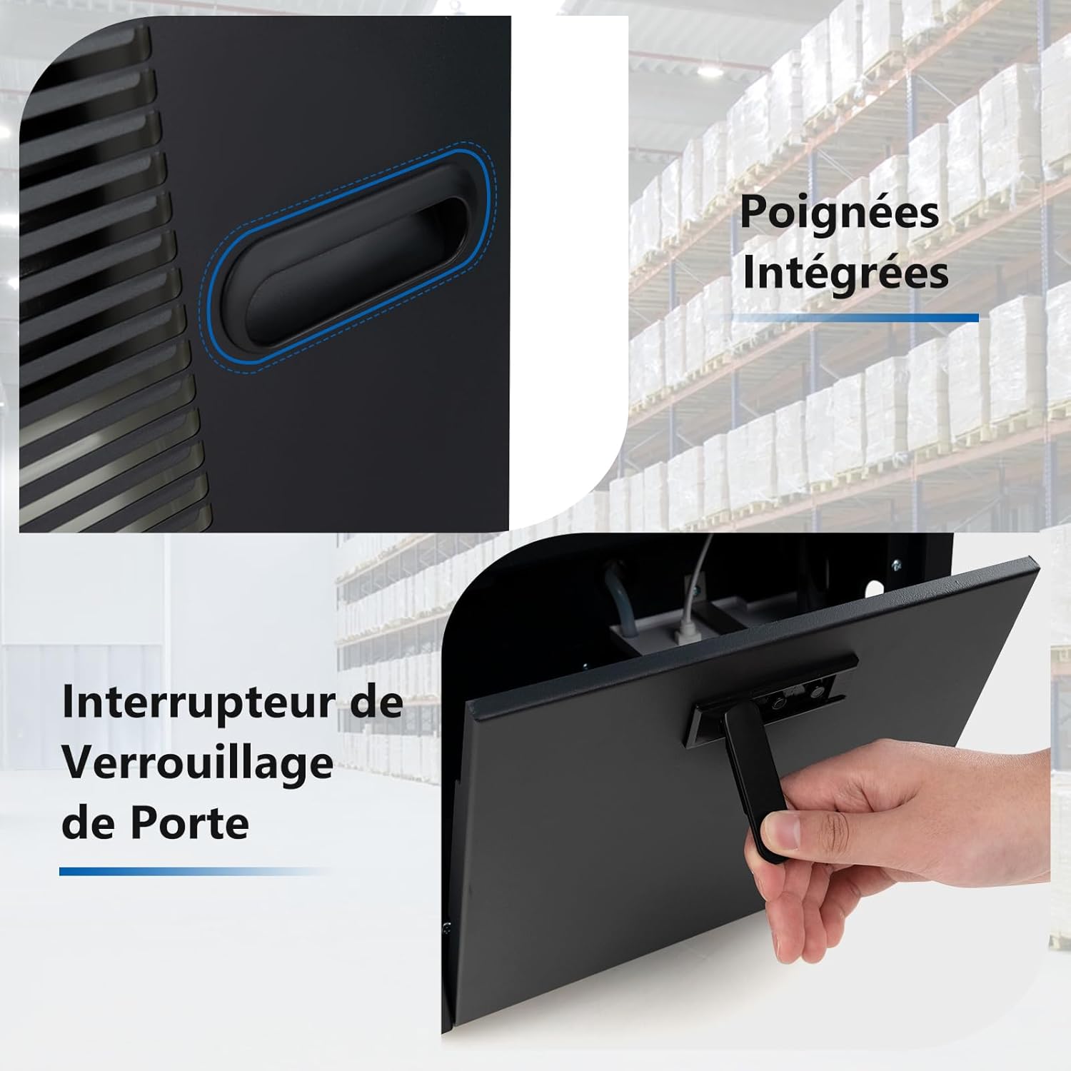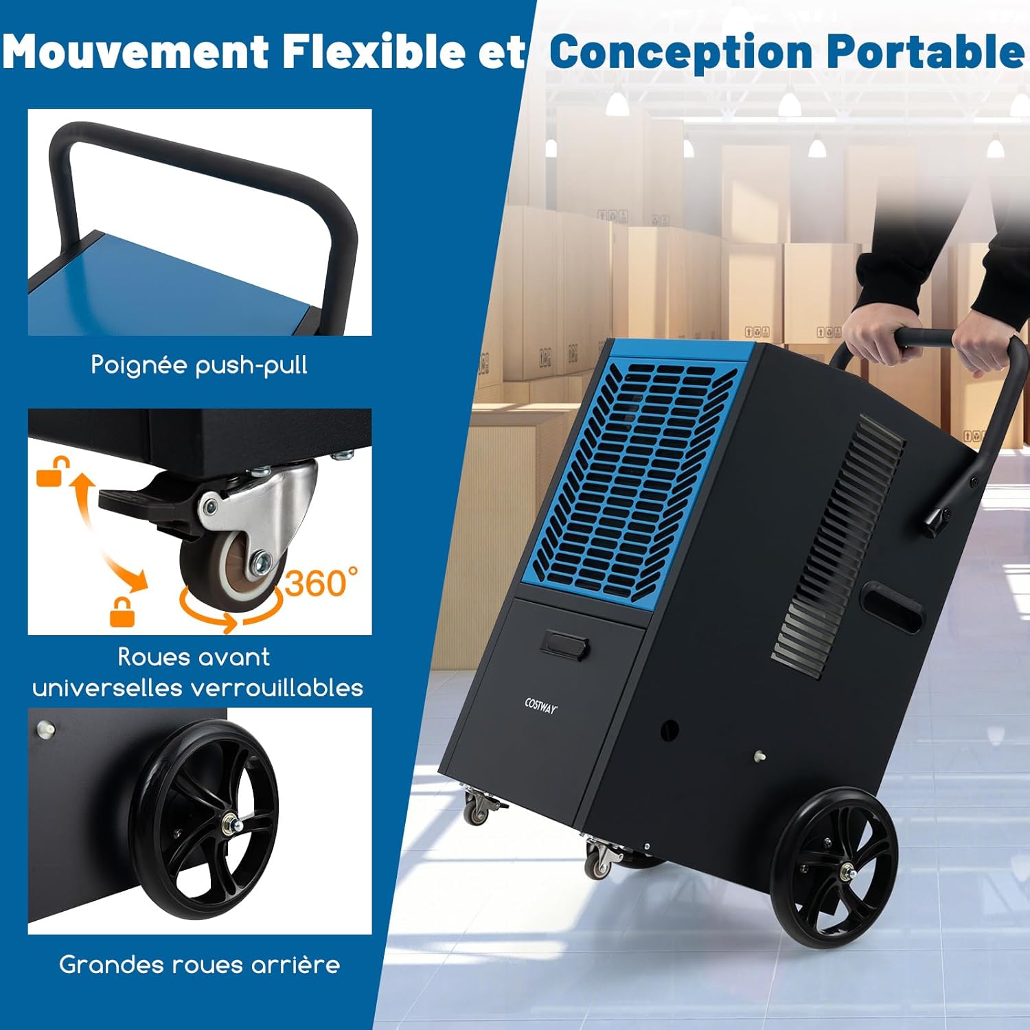 - Conception Portable : Ce déshumidificateur portable est doté d'une poignée pousser-tirer, ainsi que de 2 roues avant universelles verrouillables et de 2 grandes roues arrière, assurant un transport sans effort. De plus, les poignées intégrées des 2 côtés améliorent la maniabilité, facilitant ainsi le déplacement du déshumidificateur.