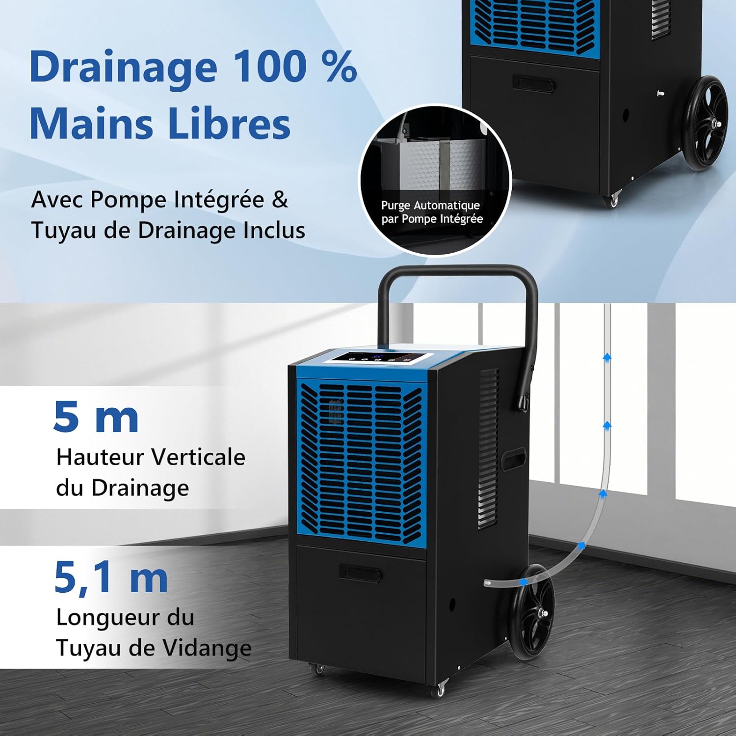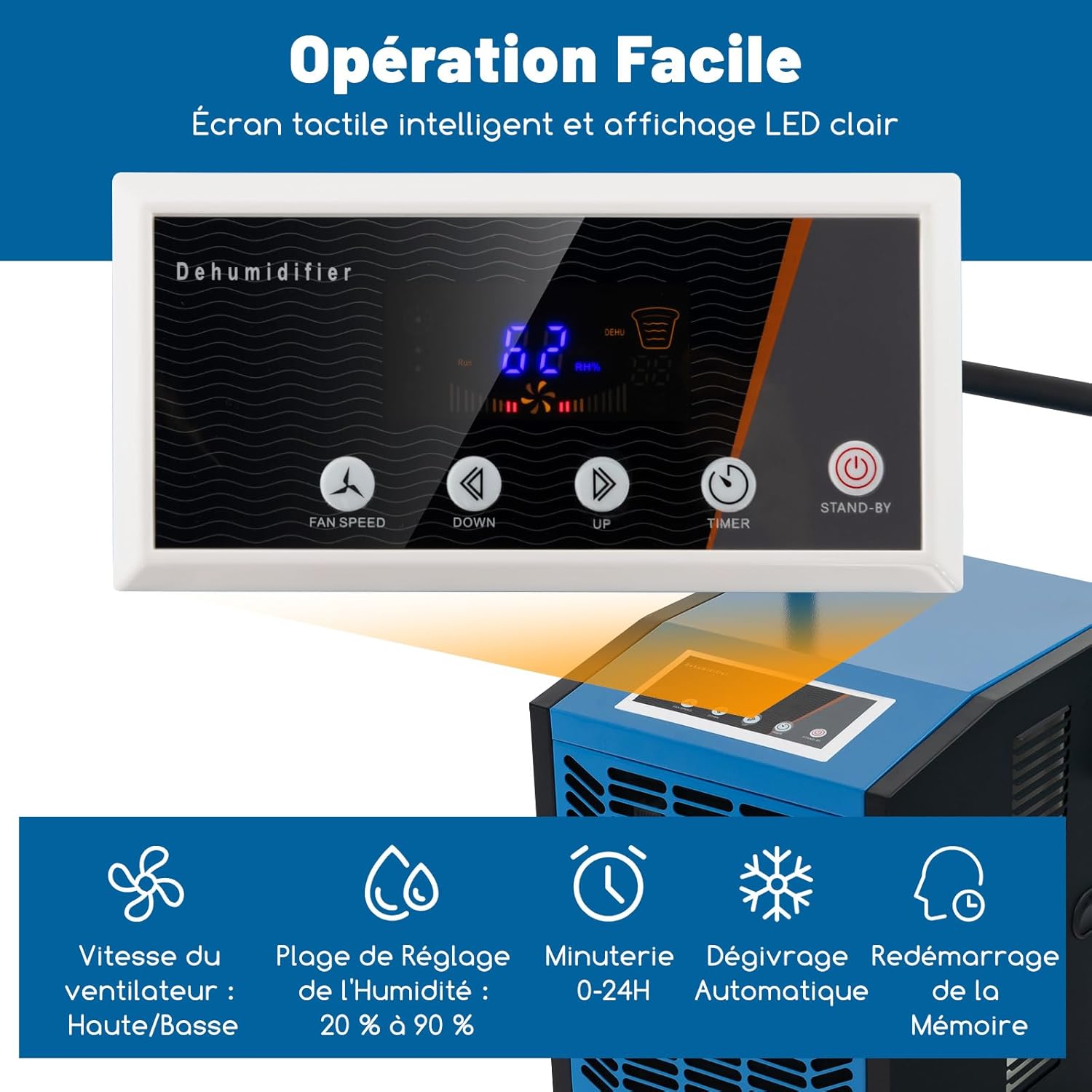 - Fonctionnement Facile et Fonction Minuterie : Doté d'un panneau de commande tactile LED, ce déshumidificateur industriel permet aux utilisateurs de personnaliser les paramètres sans effort. La fonction minuterie de 0-24 h vous permet de régler la durée de fonctionnement souhaitée. De plus, des mécanismes automatiques de dégivrage et de protection contre le débordement garantissent un fonctionnement fiable.