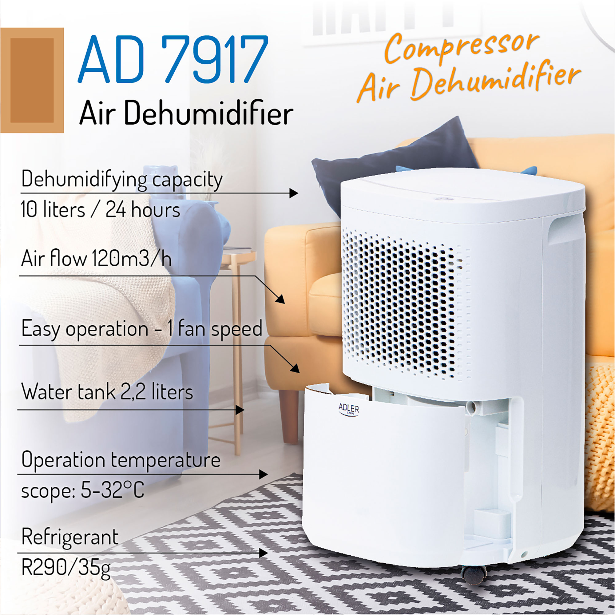 Déshumidificateur Électrique Portable, 10L / Jour, Silencieux, Pièces de 60m3 200 Blanc AdlerAD 7917