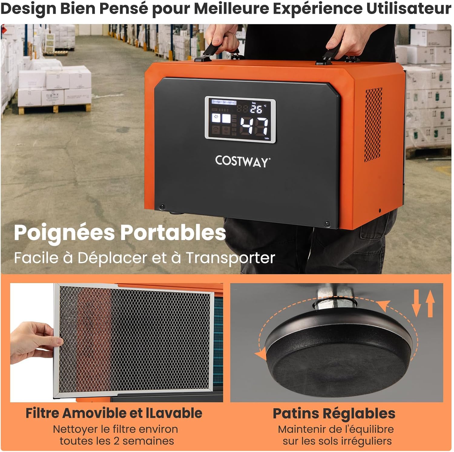 [ Design compact & portable ] Mesurant 49 x 31,5 x 32 cm (L x l x H), ce déshumidificateur commercial est conçu pour s'adapter aux espaces restreints. Des poignées portables le rendent facile à transporter tandis que 4 pieds de nivellement ajustables s'adaptent aux surfaces inégales avec aisance.