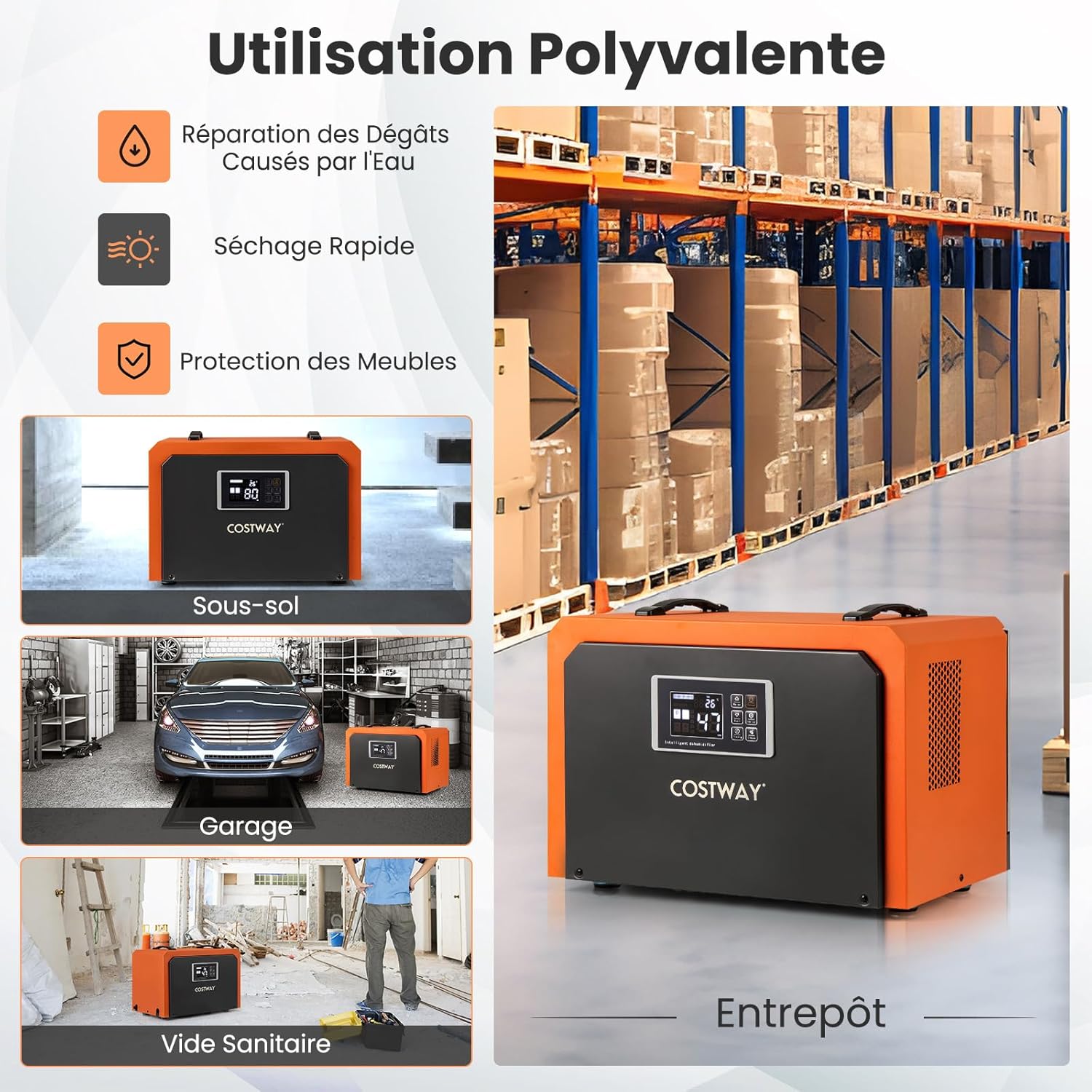[ Déshumidification haute efficacité ] Combattez l'humidité excessive avec ce déshumidificateur de 60 L/jour (35℃, 90% HR), conçu pour des espaces jusqu'à 560 ㎡. Avec un flux d'air puissant de 450 m³/h, ce déshumidificateur circule efficacement l'air dans le vide sanitaire, le sous-sol, l'entrepôt et le chantier, favorisant un séchage plus rapide.