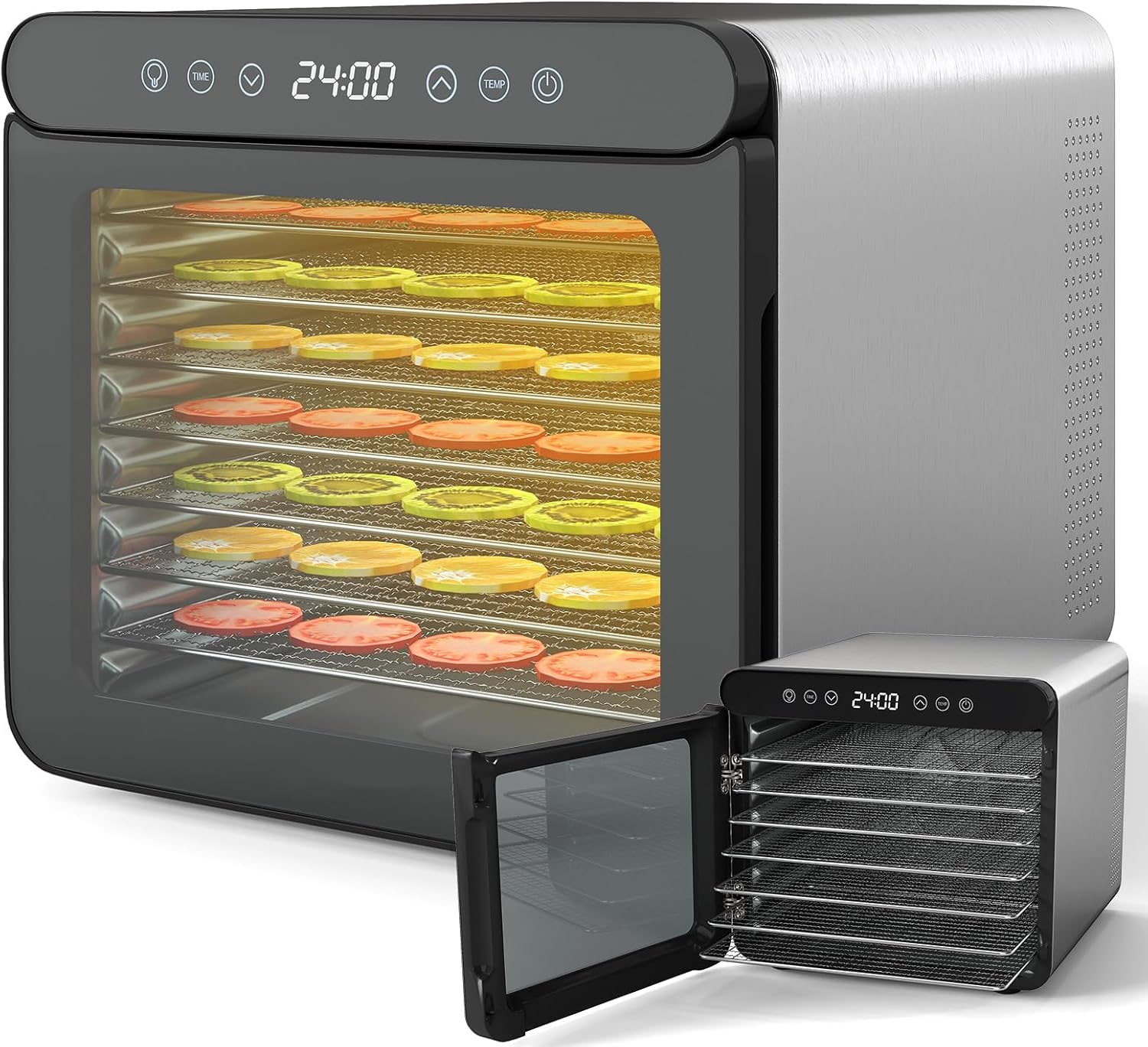- Matériau Sûr: Ce séchoir à aliments est entièrement fabriqué en acier inoxydable de haute qualité pour une résistance et une durabilité à haute température, les plateaux en acier inoxydable de qualité alimentaire sont sans BPA et sûrs avec des bords lisses et arrondis, et surtout, les plateaux sont lavables au lave-vaisselle pour un nettoyage facile.