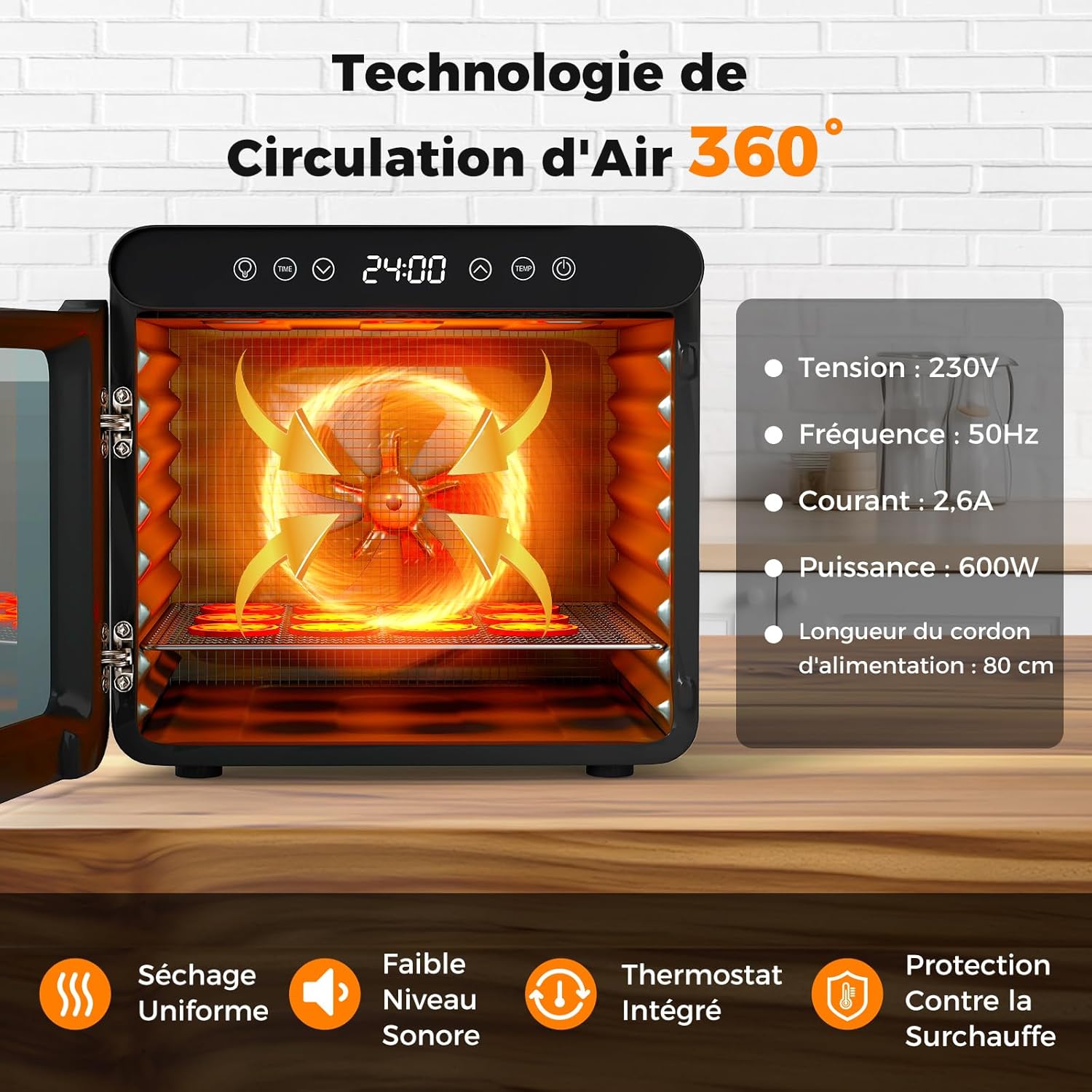 - Séchage Efficace et Uniforme: Équipé d'un moteur puissant, le déshydrateur dispose d'une circulation d'air chaud à 360° et d'un ventilateur à l'arrière pour assurer une répartition homogène de la chaleur à l'intérieur. Ainsi, les aliments peuvent être séchés efficacement et uniformément sans perte de nutriments.