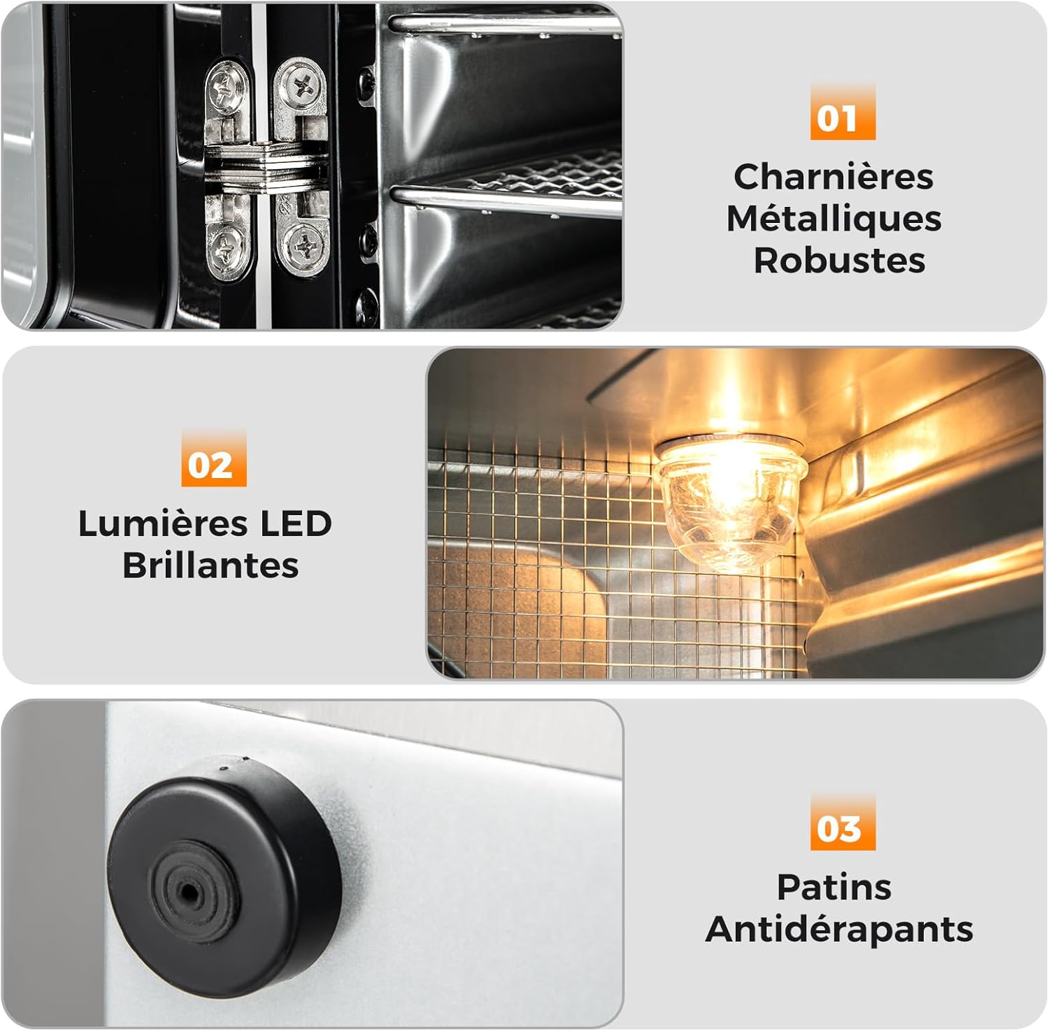 - Design Pratique: La fenêtre transparente vous permet de garder un œil sur le séchage des aliments à l'intérieur, tandis que la lumière intégrée offre un éclairage et rend le processus de séchage plus visible. De plus, la taille compacte du séchoir est parfaite pour votre espace limité dans la cuisine.