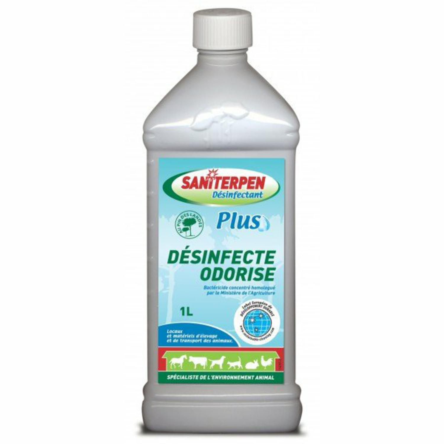 Désinfectant à base de pin de Landes pour traitement bactéricide des logements, matériels d'élevage et de transport des animaux domestiques. Neutralise les mauvaises odeurs et laisse une odeur fraiche herbacée agréable et durable. Utilisable en arrosage, aspersion, pulvérisation, groupe à pression, en dilution à 1% (10 ml pour 1 litre d'eau). Agréé sous le n°9100411. Bidon de 1 l. Nouvelle formule fraicheur verte.