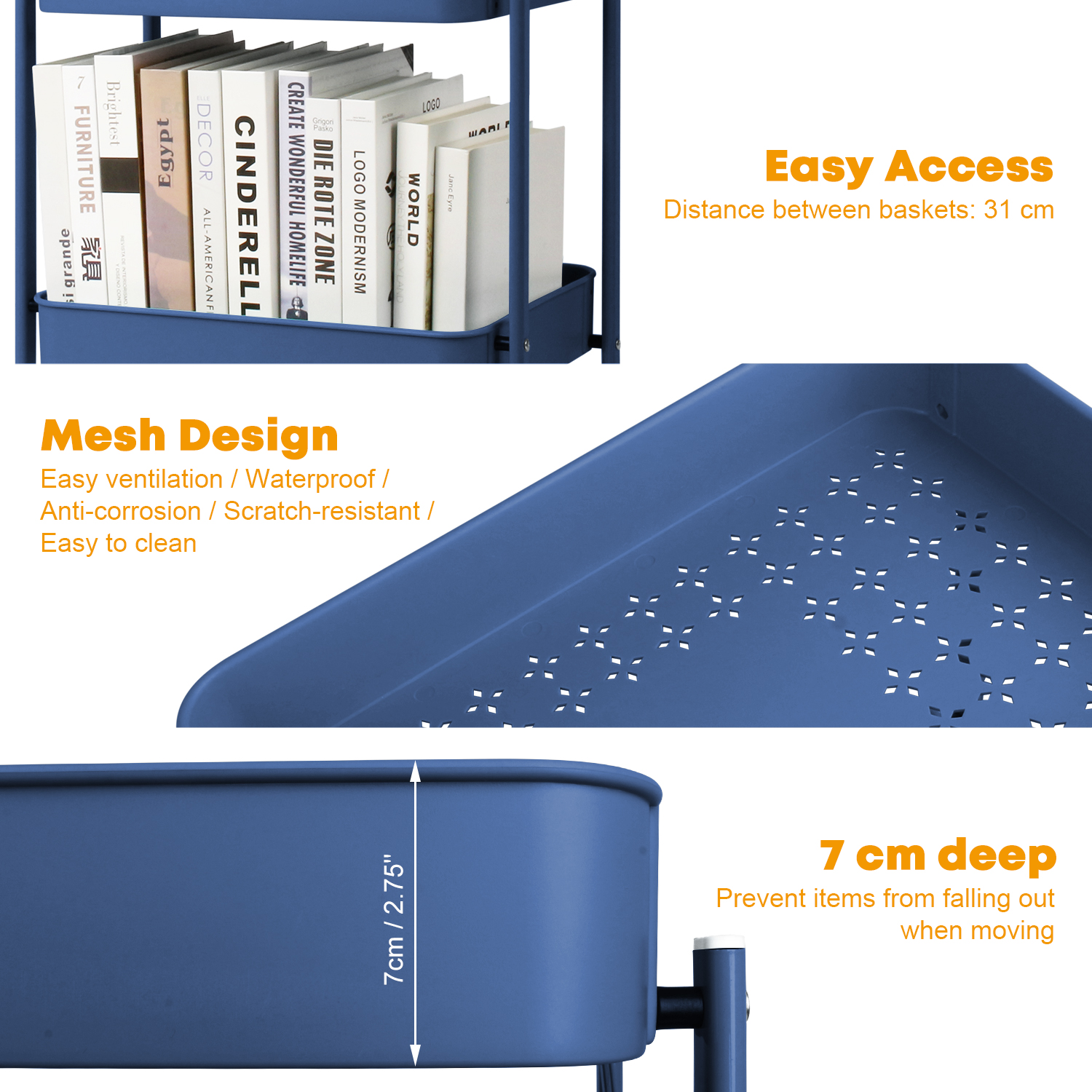 【Solide et Durable】Le cadre du chariot de stockage est en acier au carbone de haute qualité avec une forte capacité portante. Les paniers sont fabriqués en plastique ABS de haute qualité, chaque panier peut supporter jusqu'à 10 kg, la capacité totale est de 30 kg.