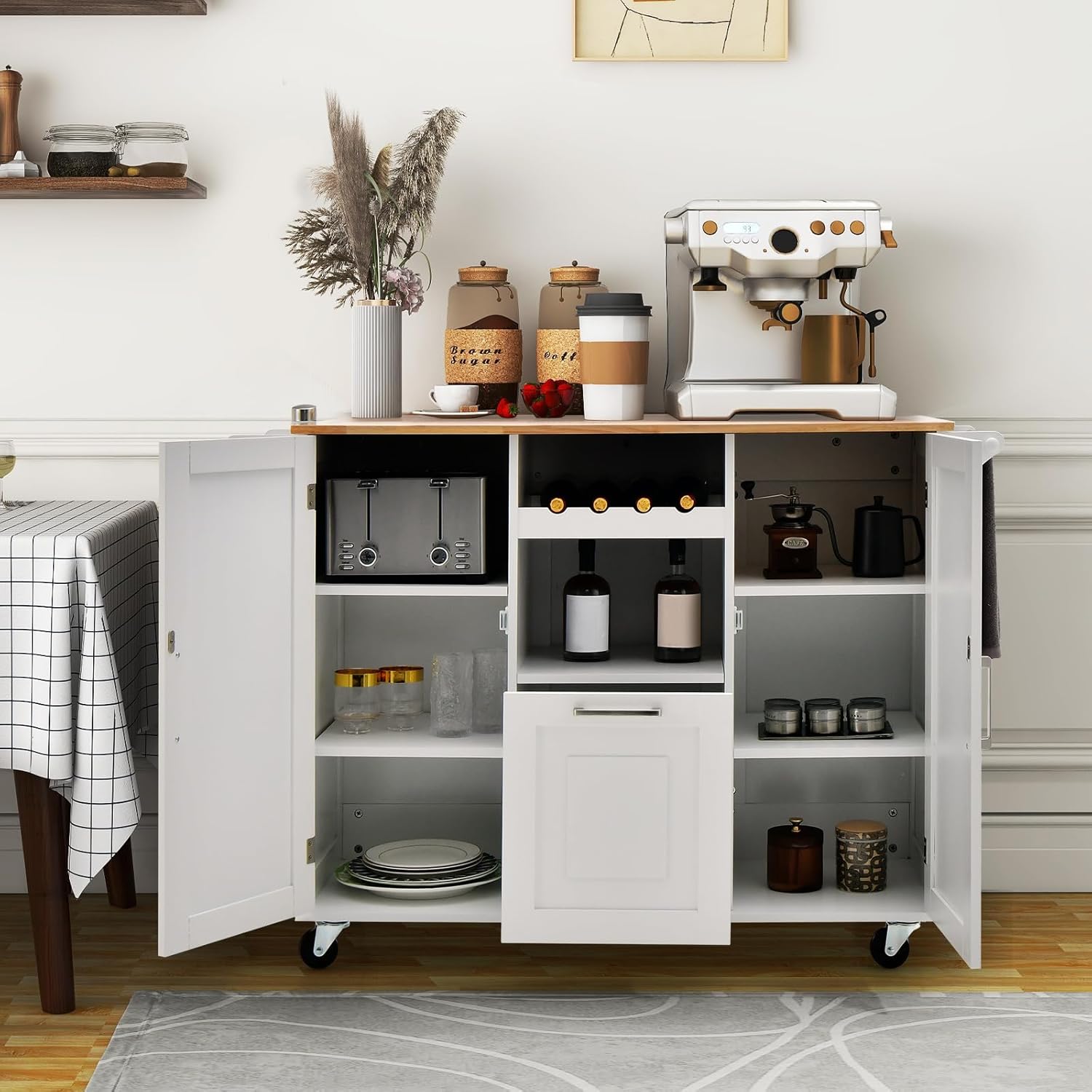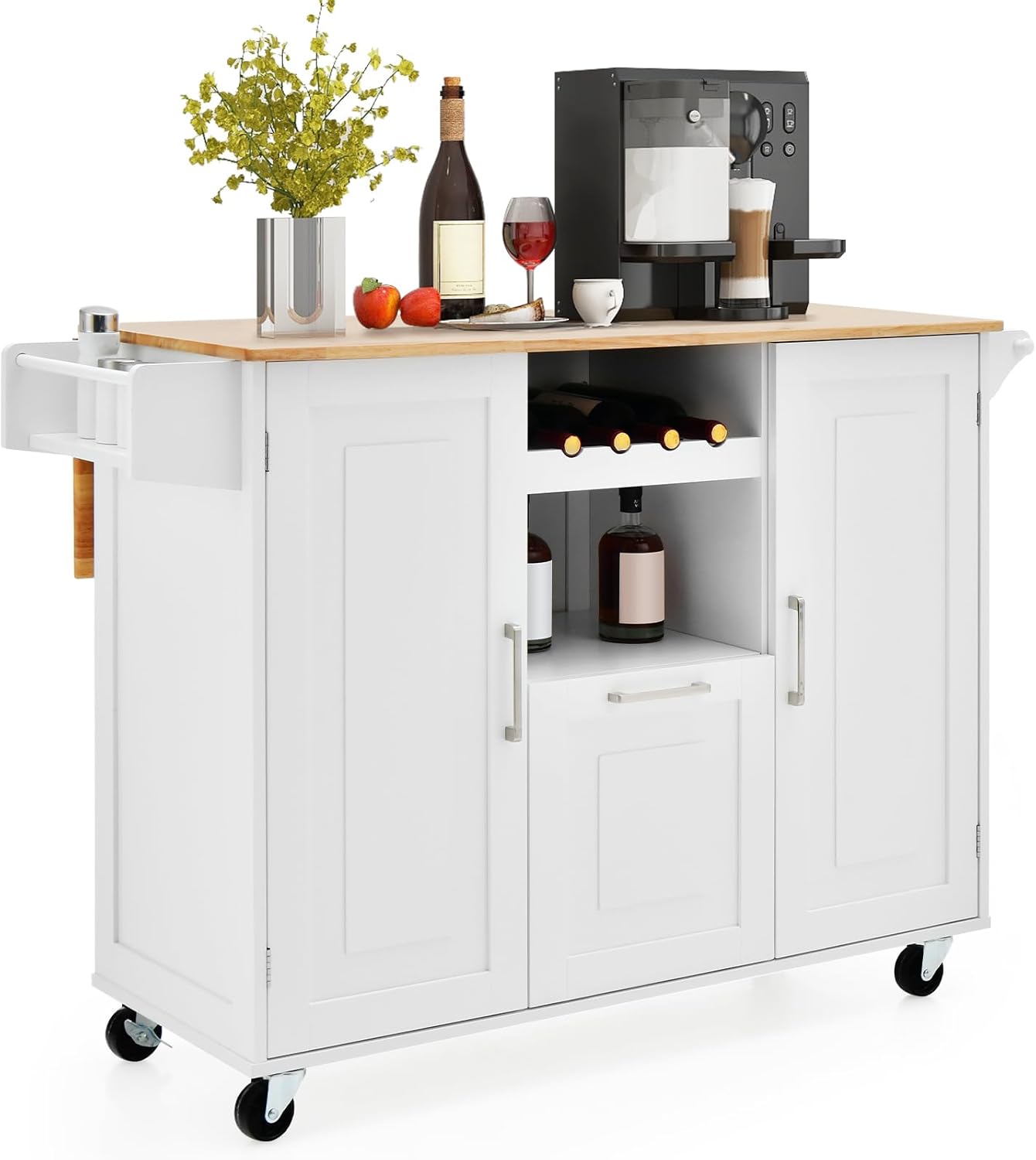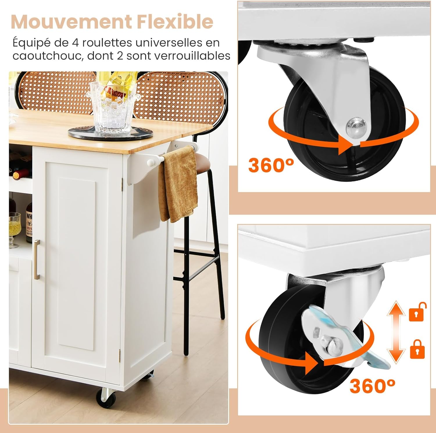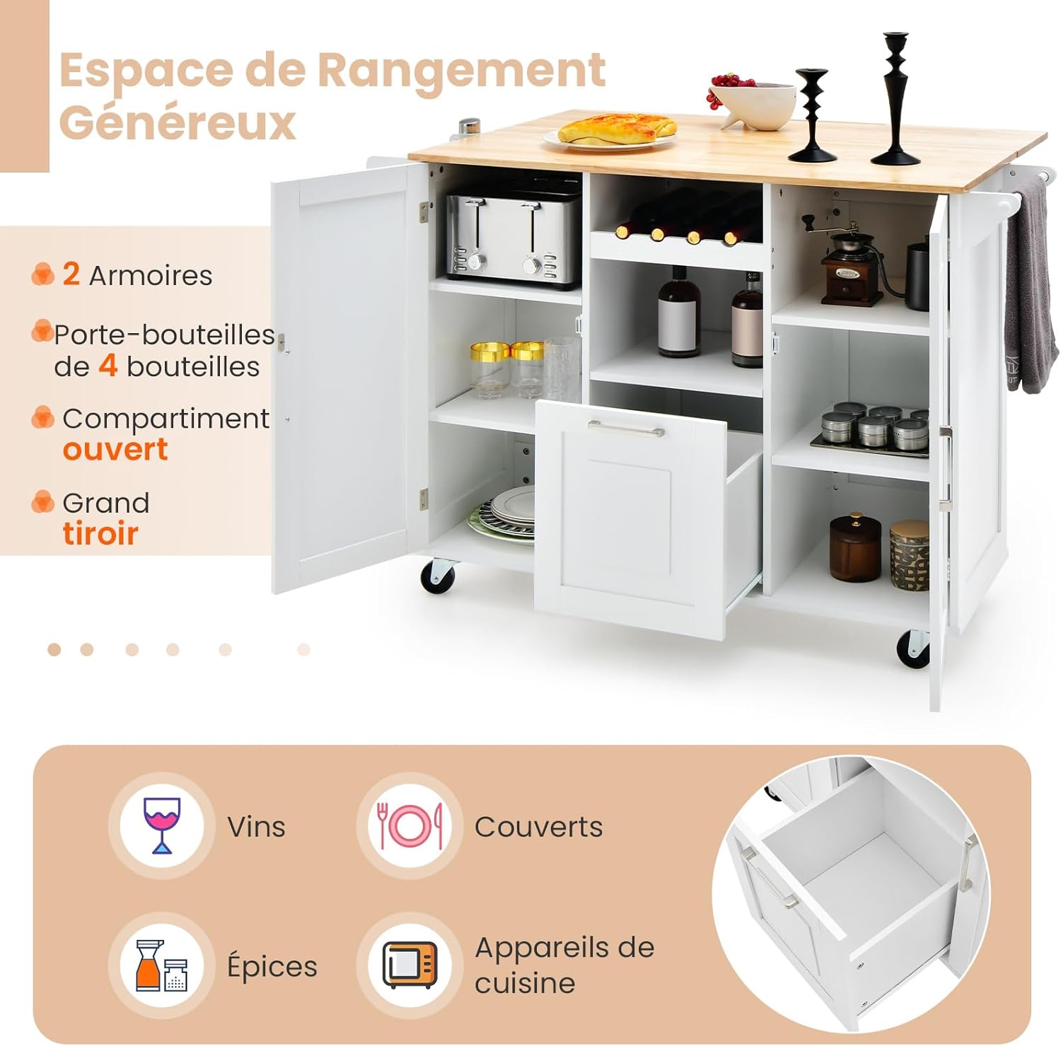 Desserte de cuisine à roulettes plateau pliable, îlot de cuisine avec porte-bouteilles, 2 armoires blanc