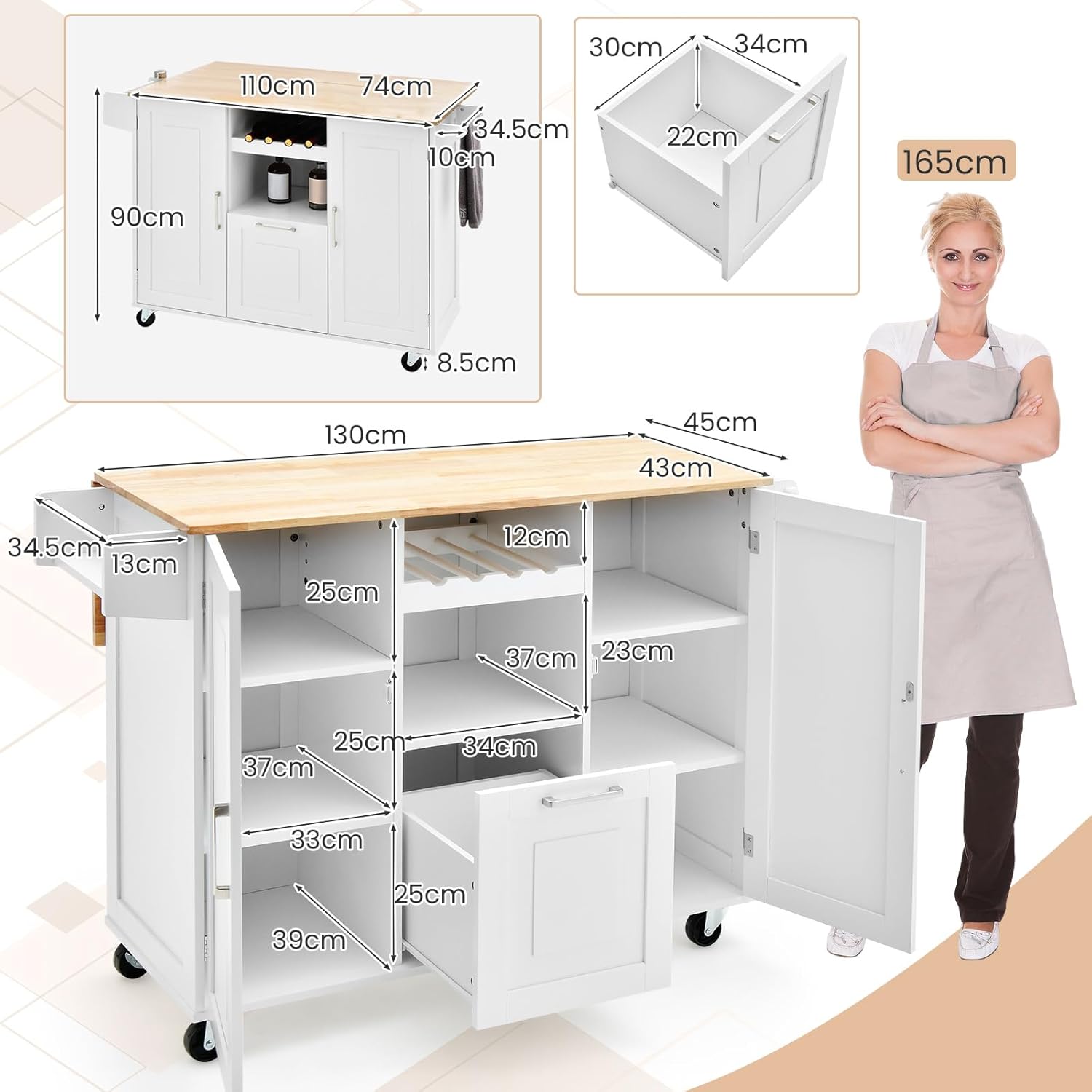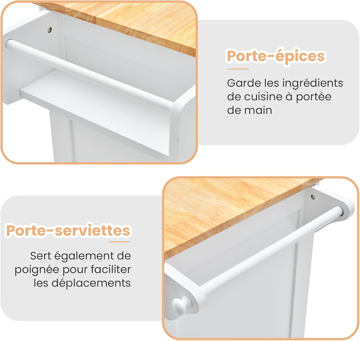 - Matériaux de qualité : Les plateaux de travail en bois de caoutchouc apportent non seulement une touche de beauté naturelle, mais offrent également une surface robuste et fiable pour la préparation des repas. Les armoires et les tiroirs sont équipés de charnières métalliques de qualité et de glissières métalliques lisses pour assurer un fonctionnement facile.