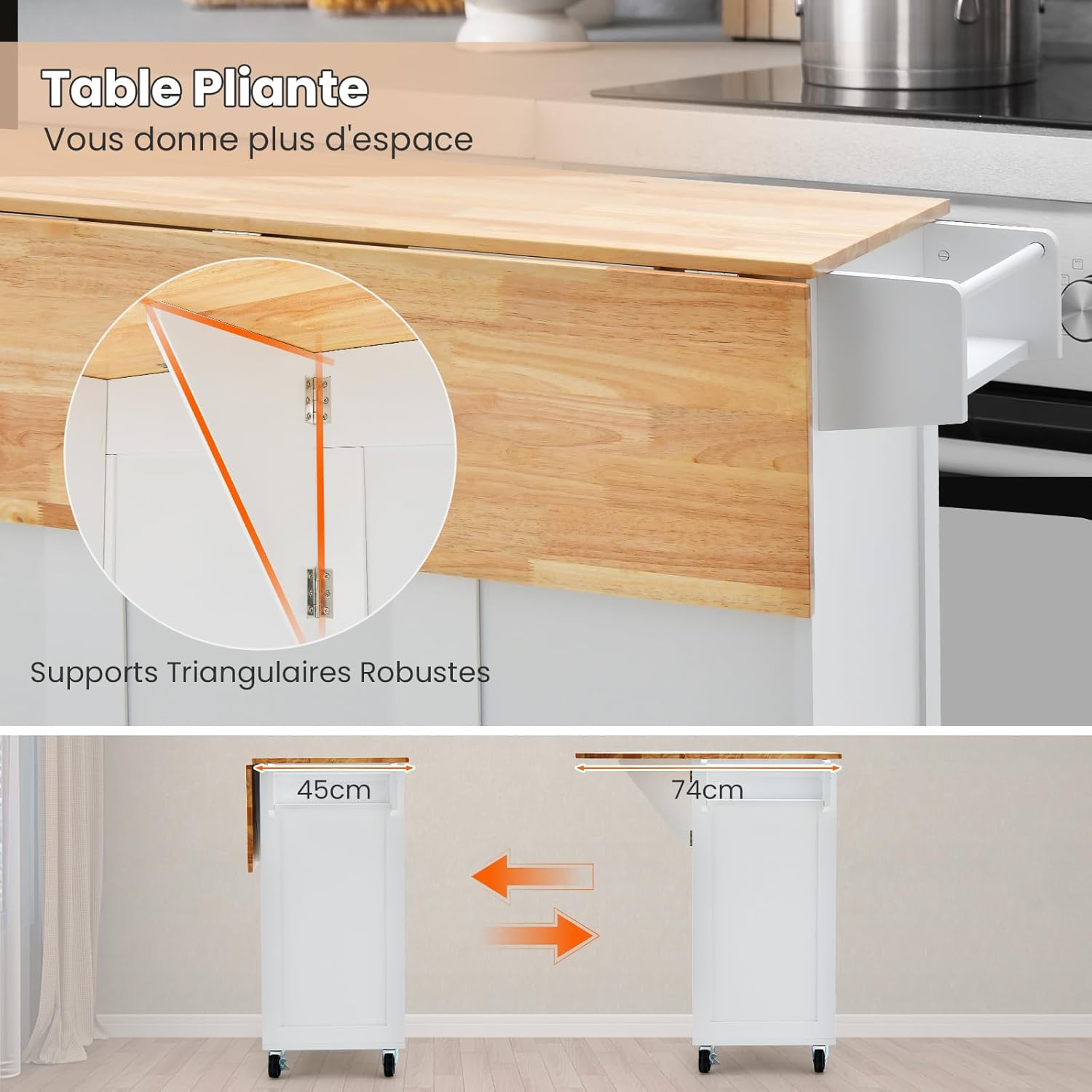 - Plateaux de travail pliables : Le chariot de cuisine est équipé d'un plateau de travail pliable qui se déplie pour offrir de l'espace supplémentaire pour la préparation des repas. Lorsqu'il n'est pas utilisé, il peut être simplement replié et rangé. Vous économiserez ainsi de la place précieuse dans la cuisine et maintiendrez l'ordre.