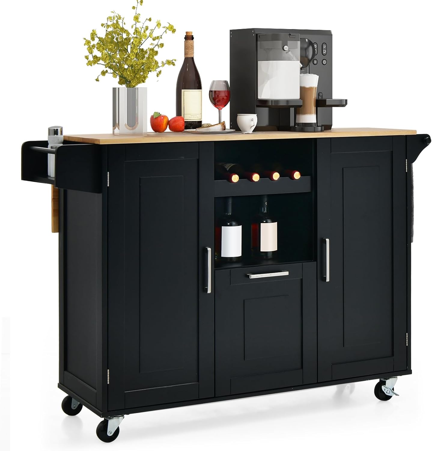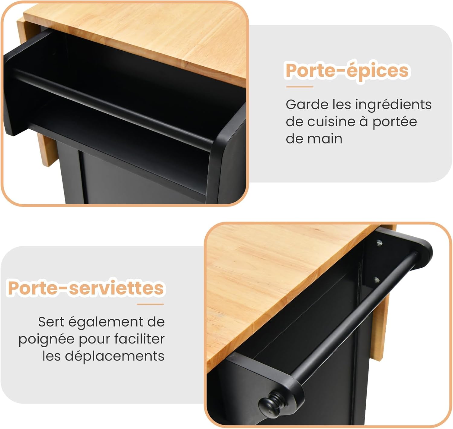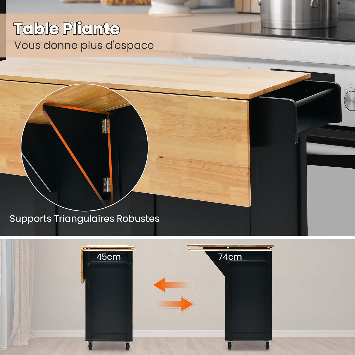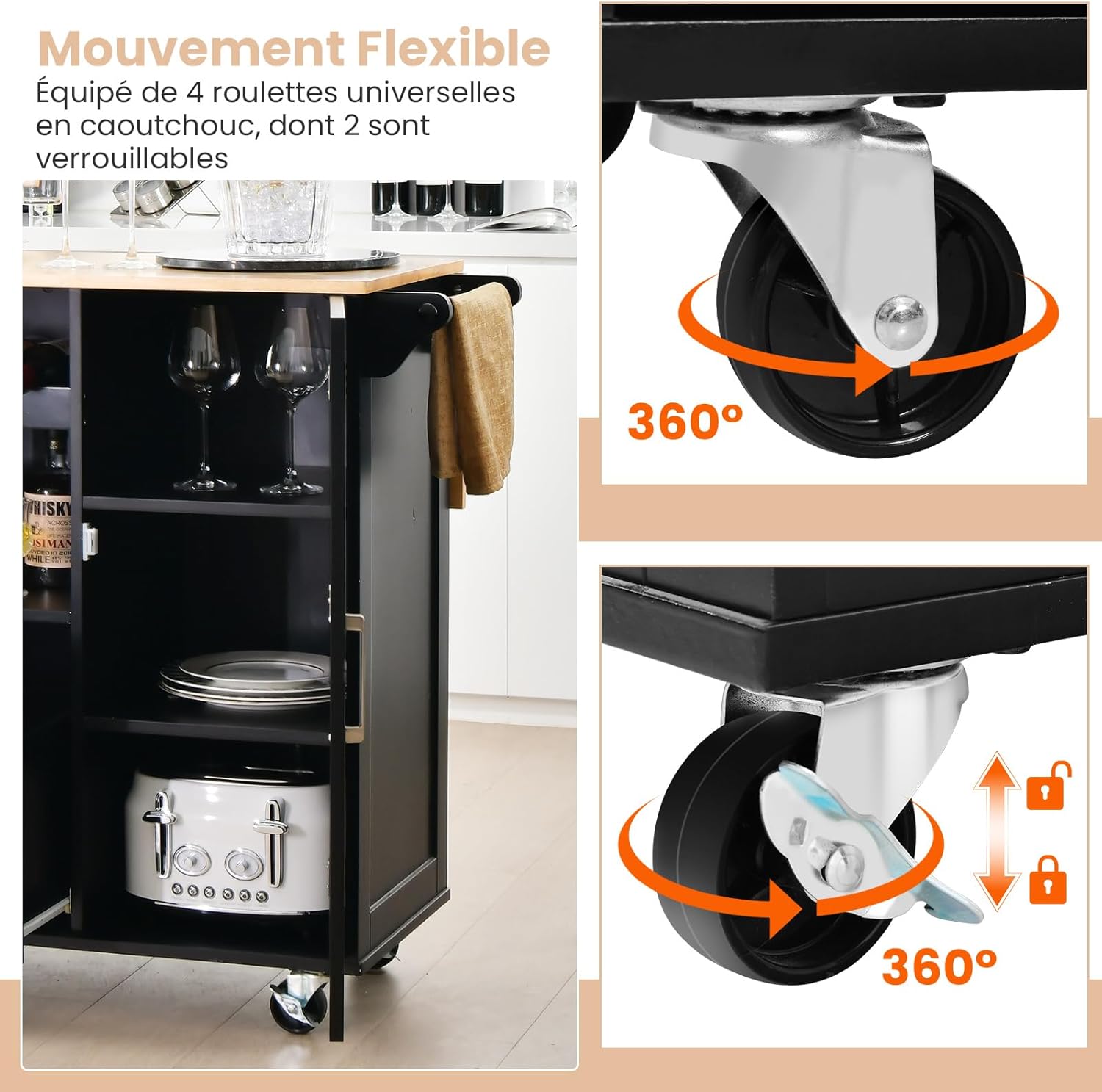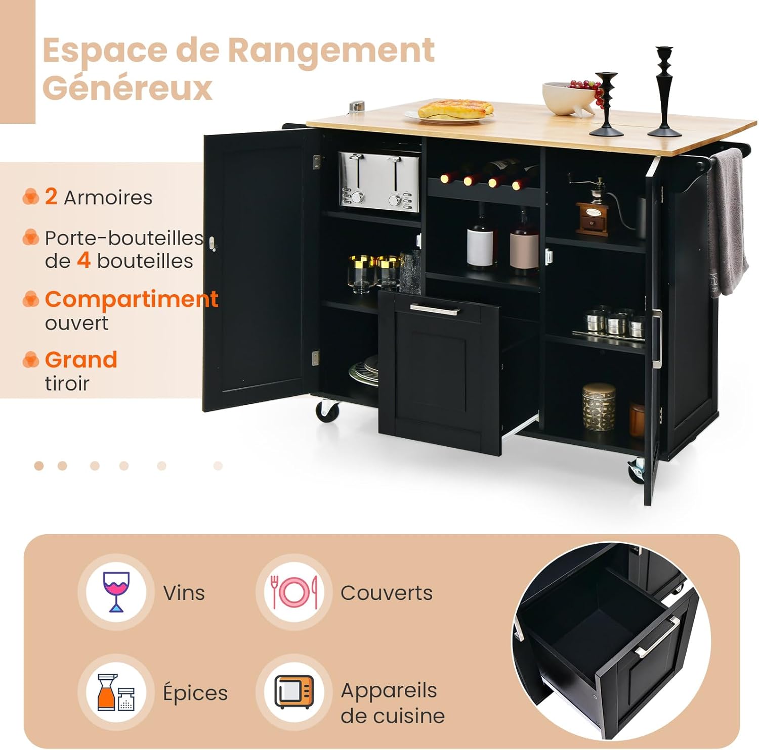 | Libellé | Desserte de cuisine à roulettes plateau pliable îlot de cuisine porte-bouteilles 2 armoires à portes,noir |
