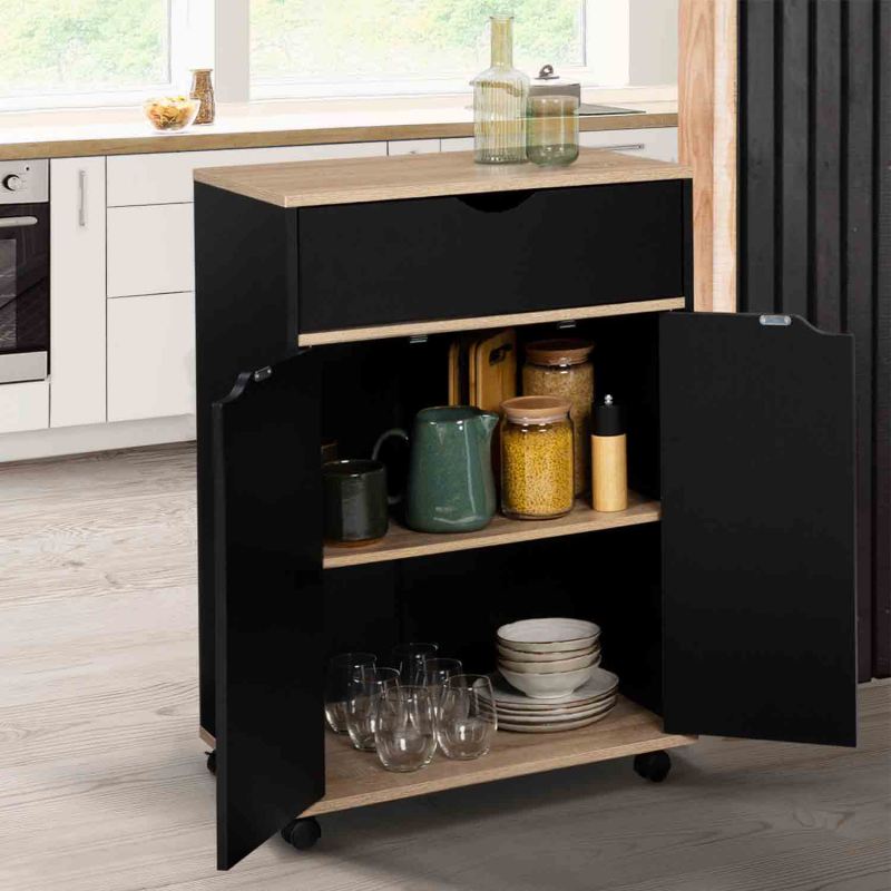 Desserte de cuisine COSY avec tiroir bois noir et plateaux façon hêtre