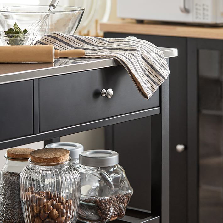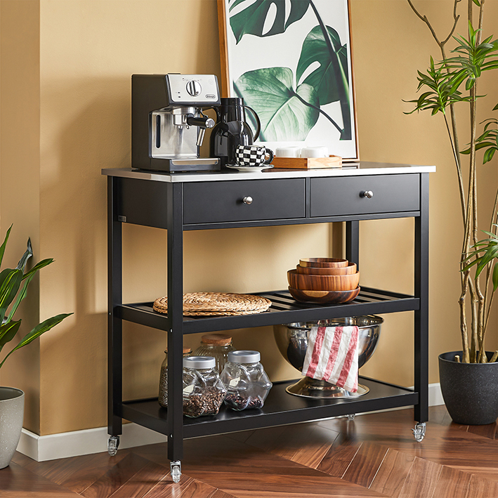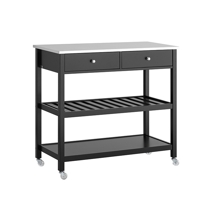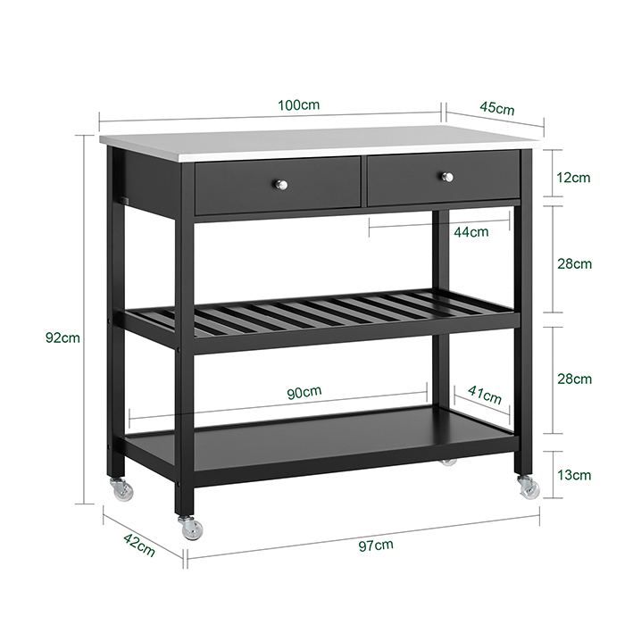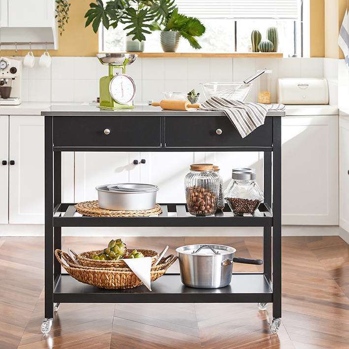 Ce meuble à roulettes, équipé d’un grand plan de travail en acier inox, 2 tiroirs et 2 étagères, vous offre beaucoup d'espace de rangement pour divers ustensiles dans la cuisine.