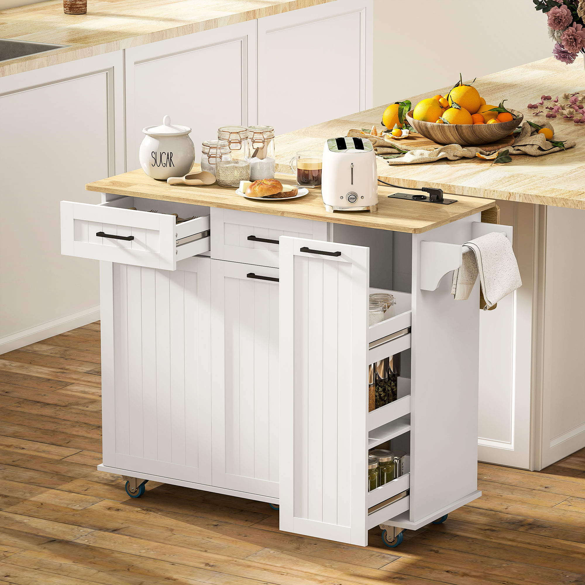 Optimisez votre espace de préparation grâce à l'îlot central à abattant HOMCOM. Profitez d'un plan de travail spacieux en bois d'hévéa, extensible pour les réceptions et pliable pour un gain de place optimal. Ne soyez plus jamais à court d'énergie grâce à la station de charge intégrée dotée de deux prises secteur, d'une prise USB et d'une prise USB-C. Cet îlot central à roulettes est équipé de tiroirs, de placards et d'étagères pour une mobilité optimale.