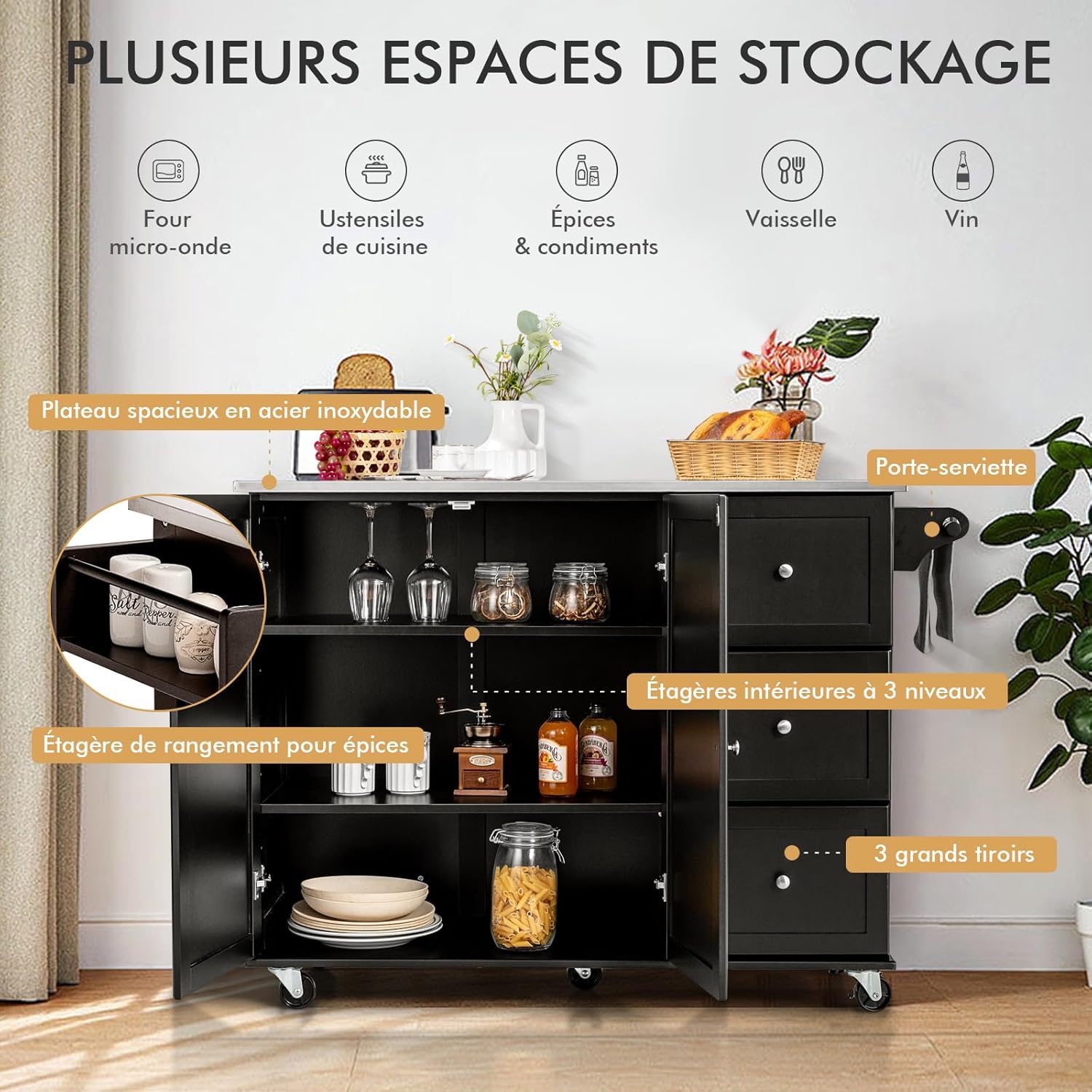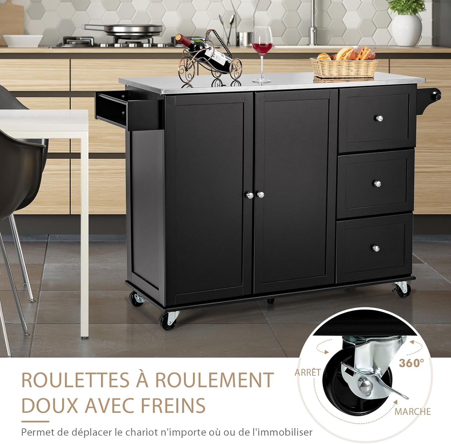 | Libellé | Desserte îlot de cuisine desserte à roulettes bois placard étagère 3 niveaux réglables et 3 tiroirs,noir |