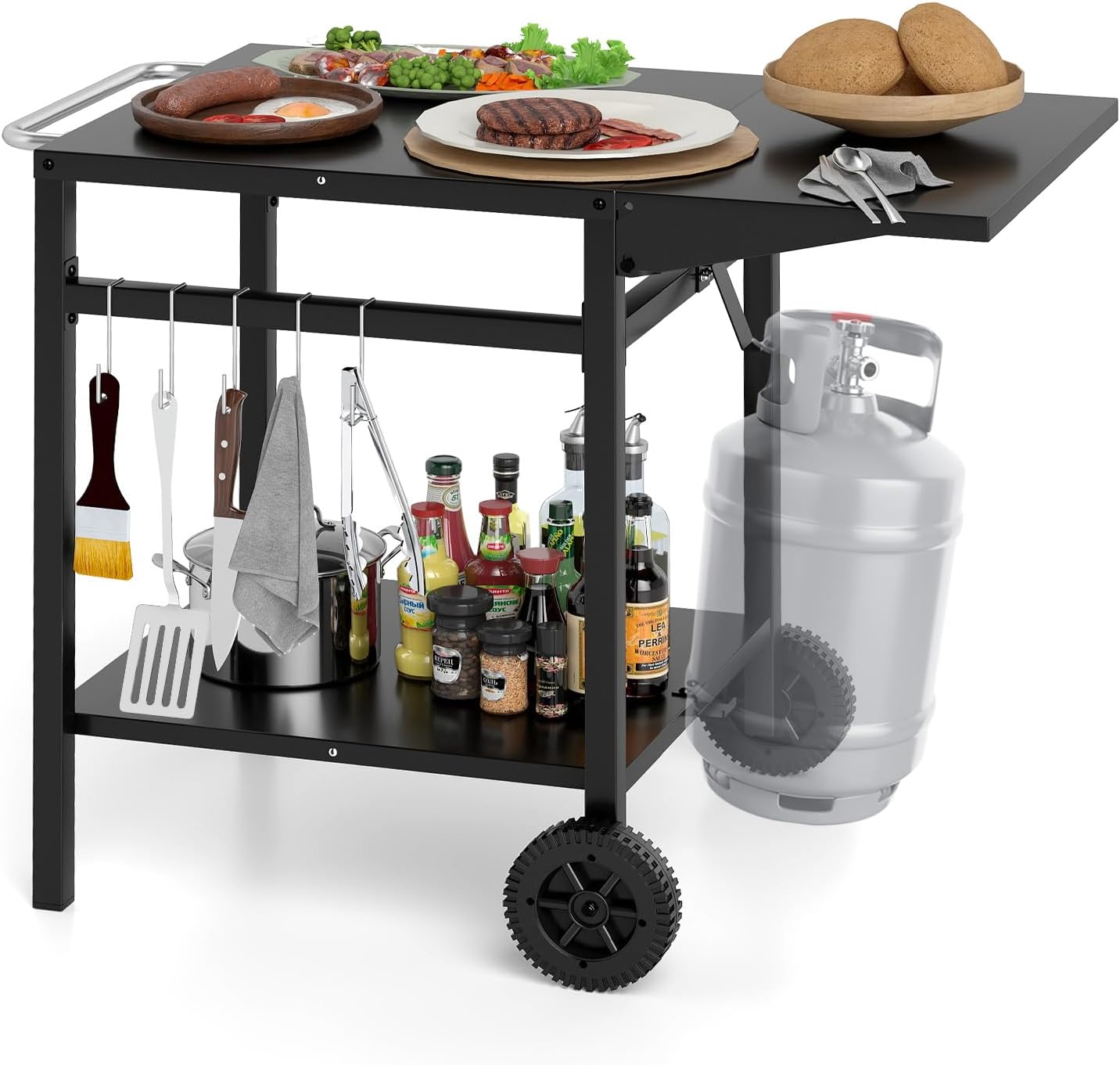 - Espace de Rangement Polyvalent : Le chariot de cuisine de 2 niveaux offre de nombreux espaces de rangement pour organiser une variété d'articles. En plus d'un plateau spacieux permettant de manipuler facilement divers ingrédients, elle est équipée d'une étagère de rangement supplémentaire, d'un crochet robuste pour les bidons de gaz et de 4 crochets amovibles pour enrichir les possibilités de rangement.
