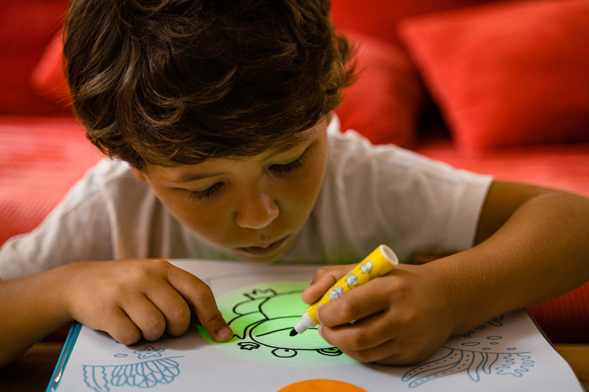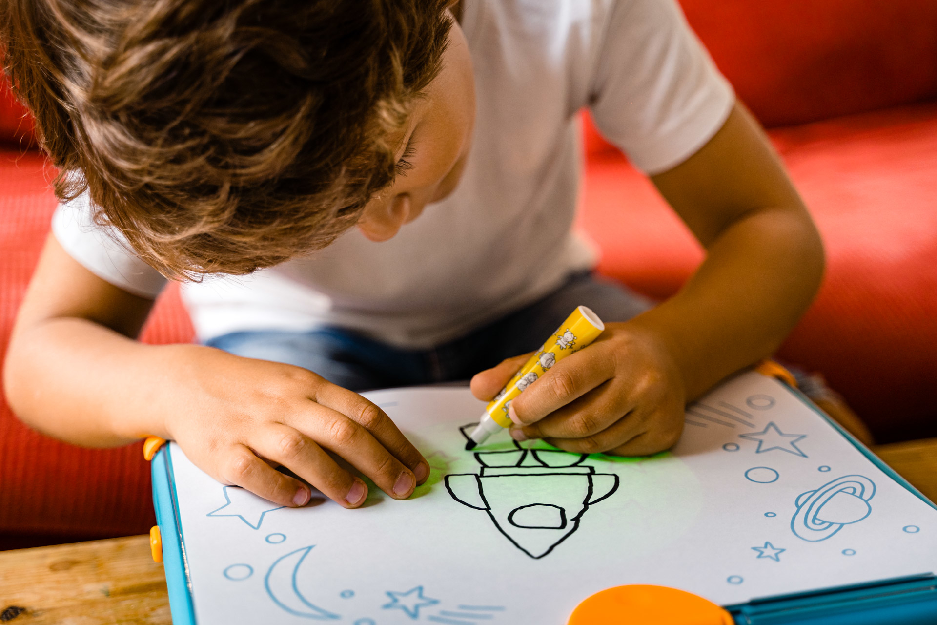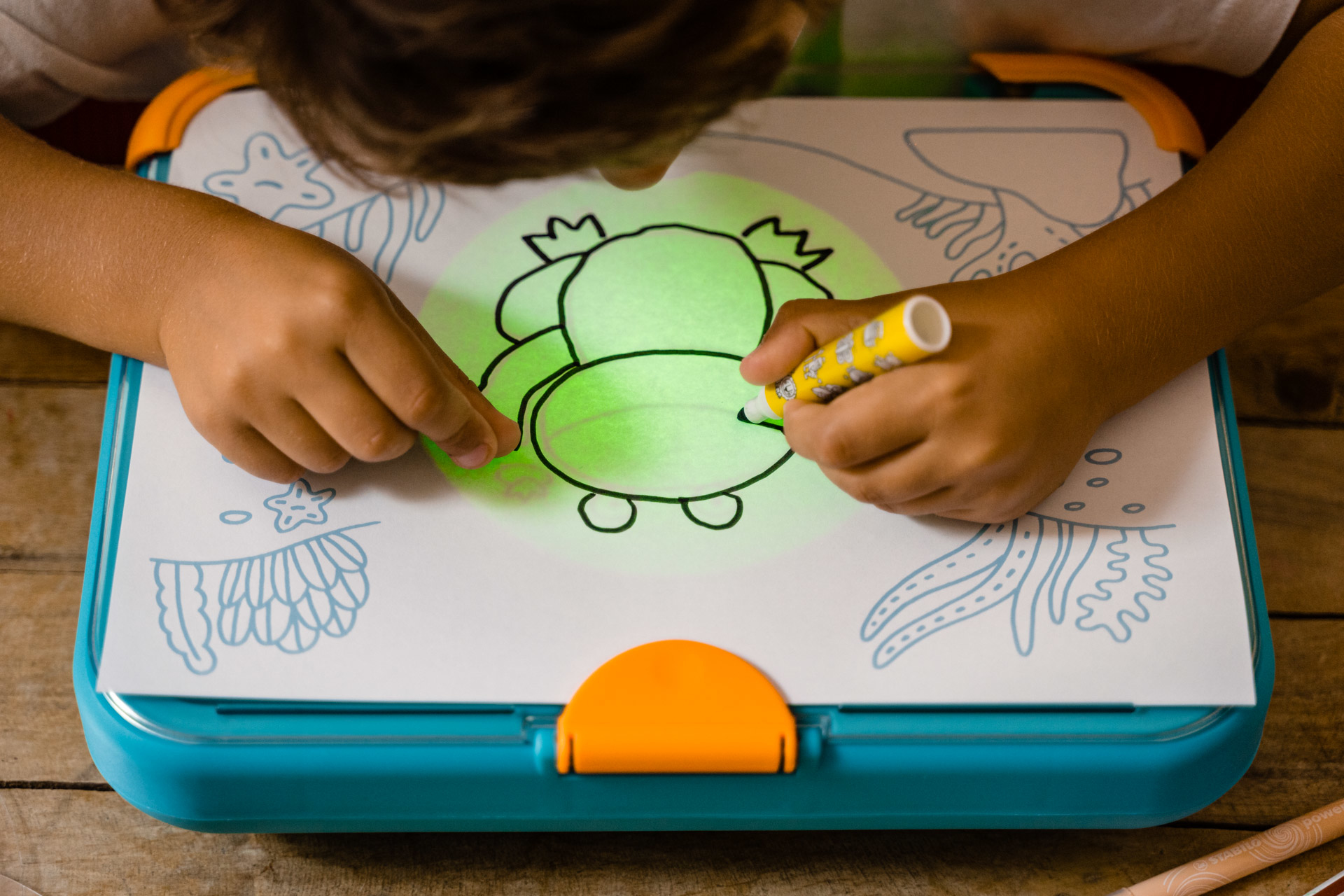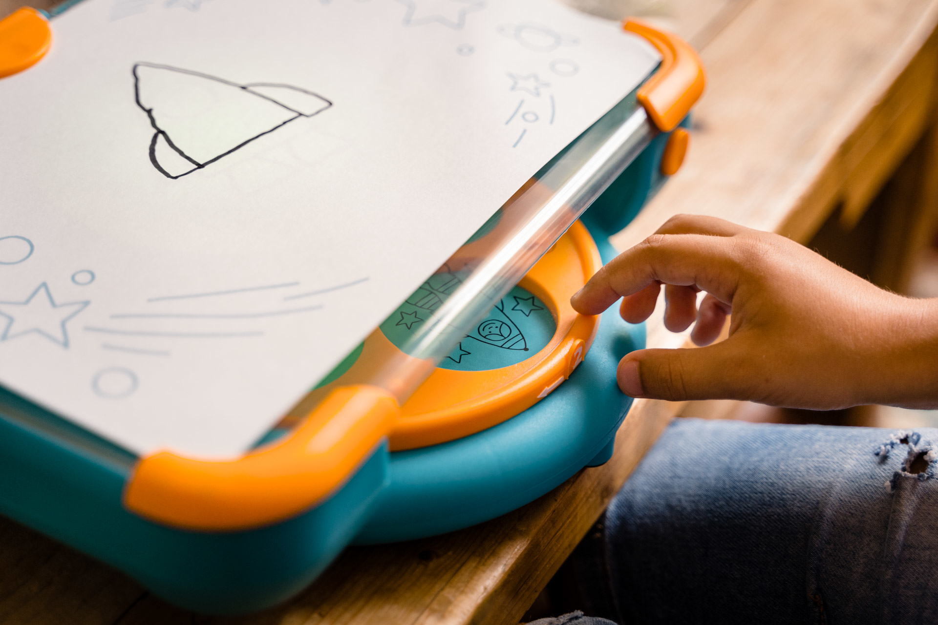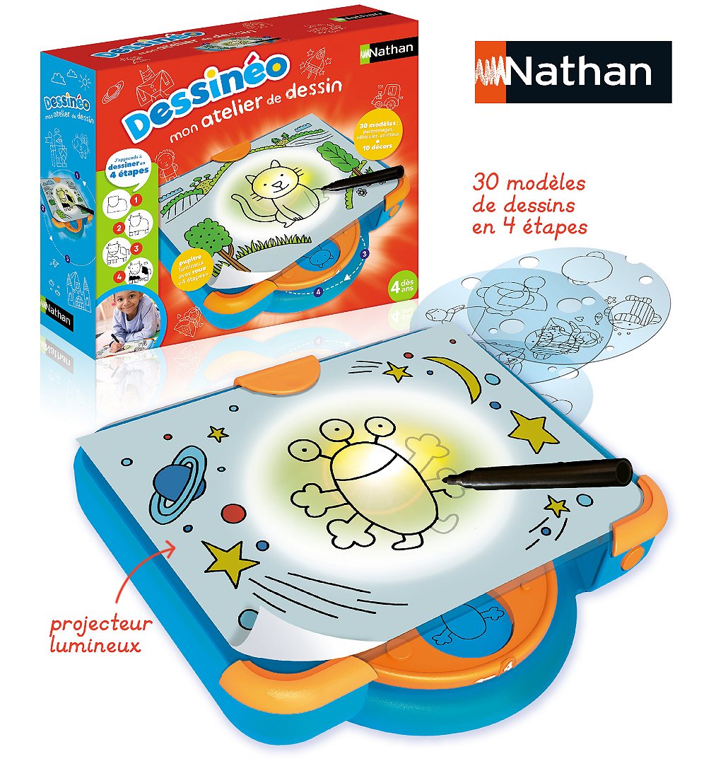 Dessineo guide l'enfant à partir de 4 ans dans ses premiers pas d'artiste. Il choisit un modèle, le place sur la roue, pose une feuille de papier sur le pupitre lumineux et dessine pas à pas jusqu'à l'image finalisée. Un jeu d'apprentissage de dessin vraiment éducatif dans une malette à emporter partout.