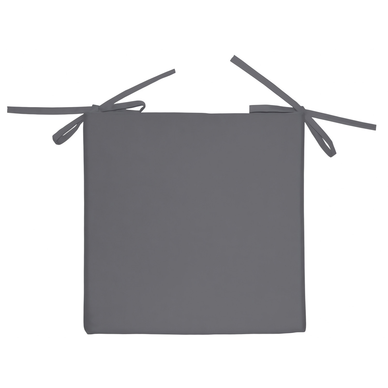 Galette de chaise extérieure enduite imperméable. Finition: - A nouettes. Couleur: - Anthracite. Composition: - enveloppe: 100% polyester, - garnissage: mousse polyuréthane. Dimensions: - 40x40x5 cm. Entretien: - Lavage en machine à 30 degrés.
