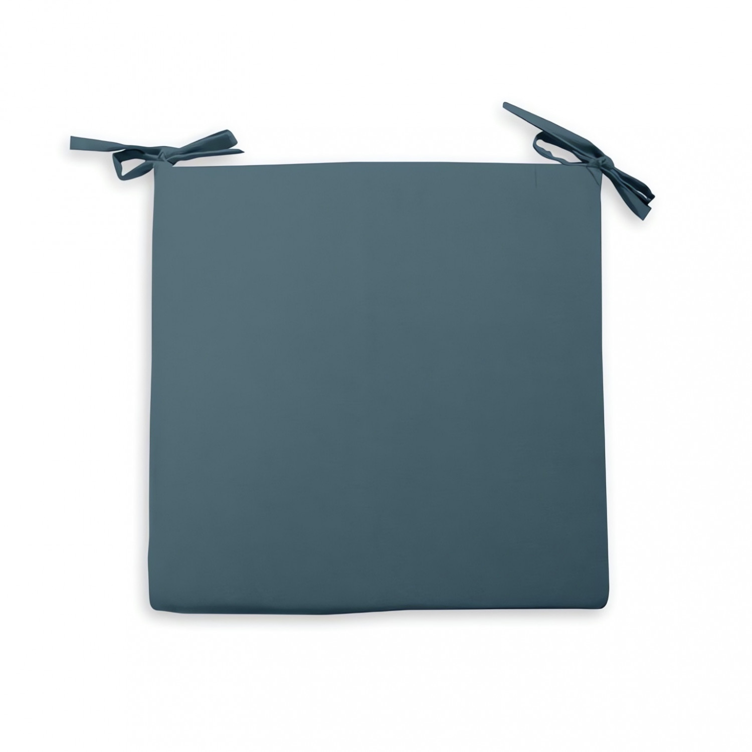 Galette de chaise extérieure enduite imperméable. Finition: - A nouettes. Couleur: - Bleu celadon. Composition: - enveloppe: 100% polyester, - garnissage: mousse polyuréthane. Dimensions: - 40x40x5 cm. Entretien: - Lavage en machine à 30 degrés.