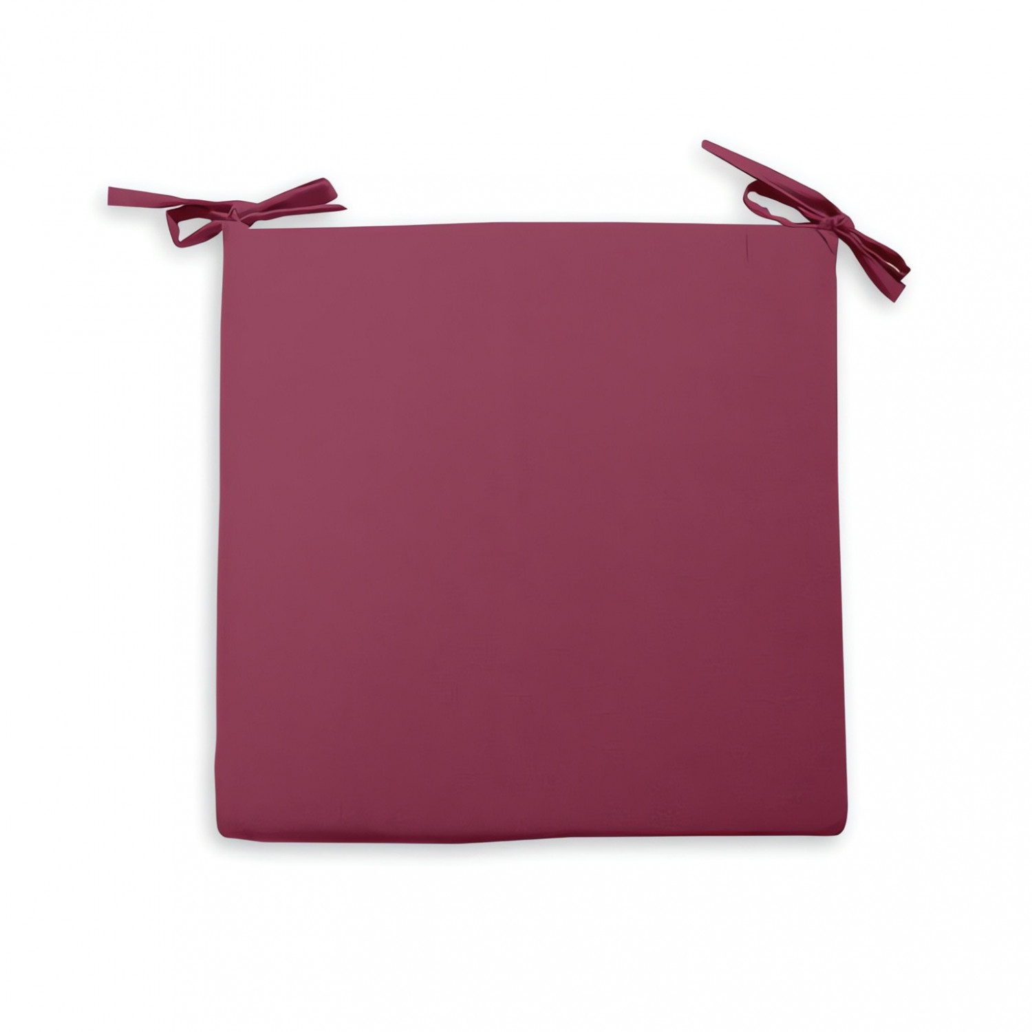Galette de chaise extérieure enduite imperméable. Finition: - A nouettes. Couleur: - Framboise. Composition: - enveloppe: 100% polyester, - garnissage: mousse polyuréthane. Dimensions: - 40x40x5 cm. Entretien: - Lavage en machine à 30 degrés.