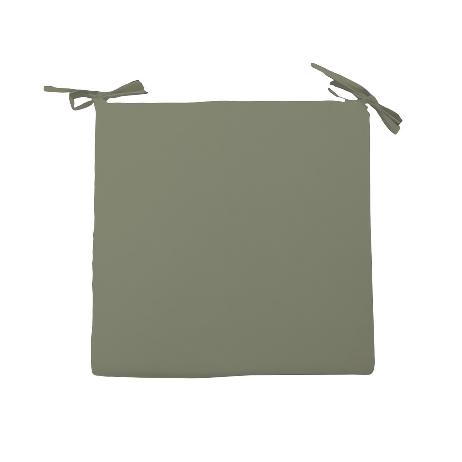 Galette de chaise extérieure enduite imperméable. Finition: - A nouettes. Couleur: - Kaki. Composition: - enveloppe: 100% polyester - garnissage: mousse polyuréthane. Dimensions: - 40x40x5 cm. Entretien: - Lavage en machine à 30 degrés.