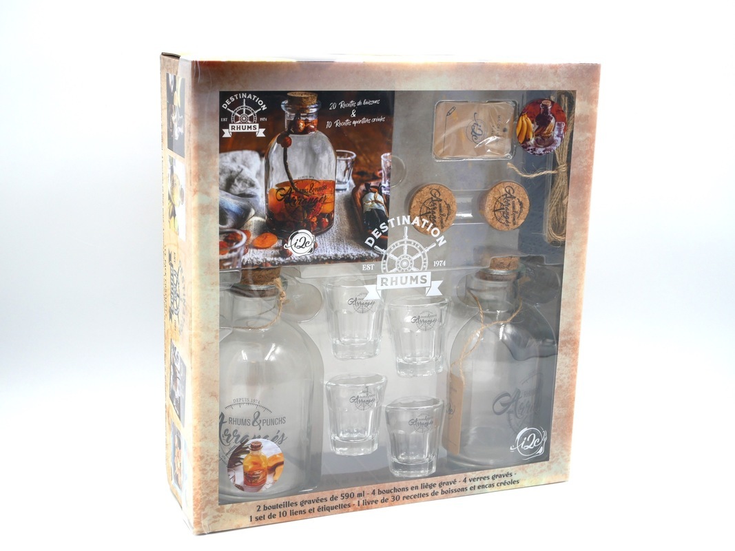 Les 20 recettes de rhums arrangés et de punchs sont à réaliser dans 2 bouteilles en verre gravée de 590 ml , et à déguster dans 4 verres gravés. Le coffret comprend également , 4 bouchons en liège et un jeu d'étiquettes et de liens en raphia !