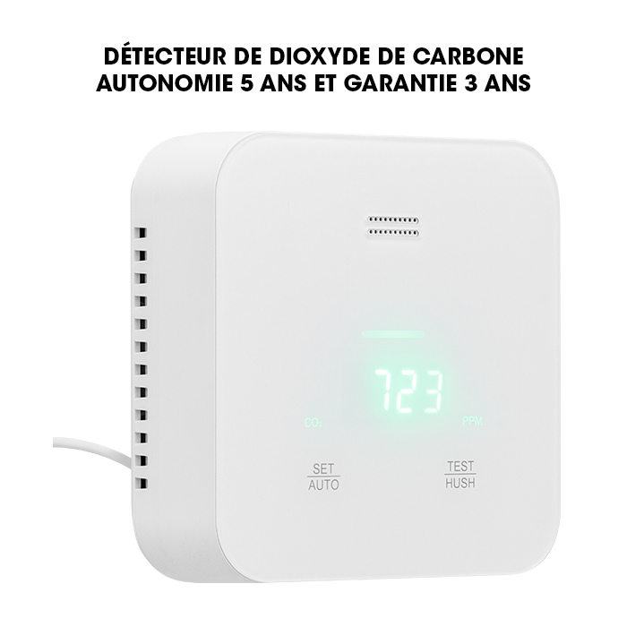 Le détecteur de CO2 dispose également d'un bouton TEST/PAUSE qui permet de passer l'appareil en mode silence pendant 10 min et de tester le bon fonctionnement de l'alarme.