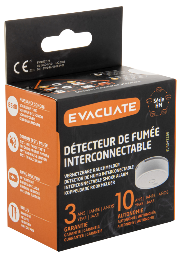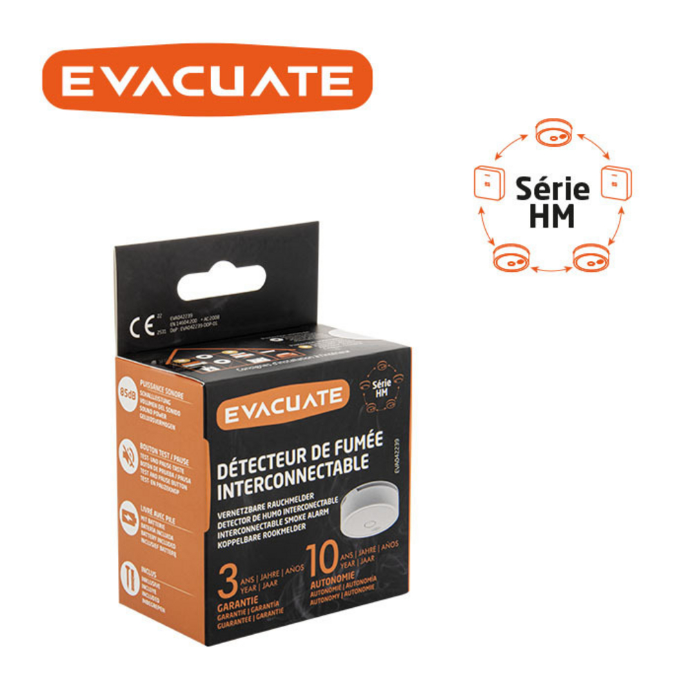 Ce détecteur de fumée interconnectable (livré avec pile), muni d'un capteur optique, est destiné à être installé dans des immeubles d'habitation, des appartements et des pièces à usage résidentiel. Grâce à son module interconnectable, il communique avec tous les autres détecteurs interconnectables. Les détecteurs EVACUATE de la série HM peuvent être connectés entre eux, sans aucun fil, jusqu'à 40 appareils. Si un seul appareil détecte une menace, tous se déclenchent. Par exemple un détecteur de fumée qui sonne au premier étage peut ne pas toujours être audible dans la cuisine. Cette situation de risque change avec ce détecteur de fumée interconnectable. Les détecteurs de fumée sont conçus pour avertir rapidement de la présence de fumée et d'incendie, afin de pouvoir réagir de manière adéquate face à cet évènement dangereux.