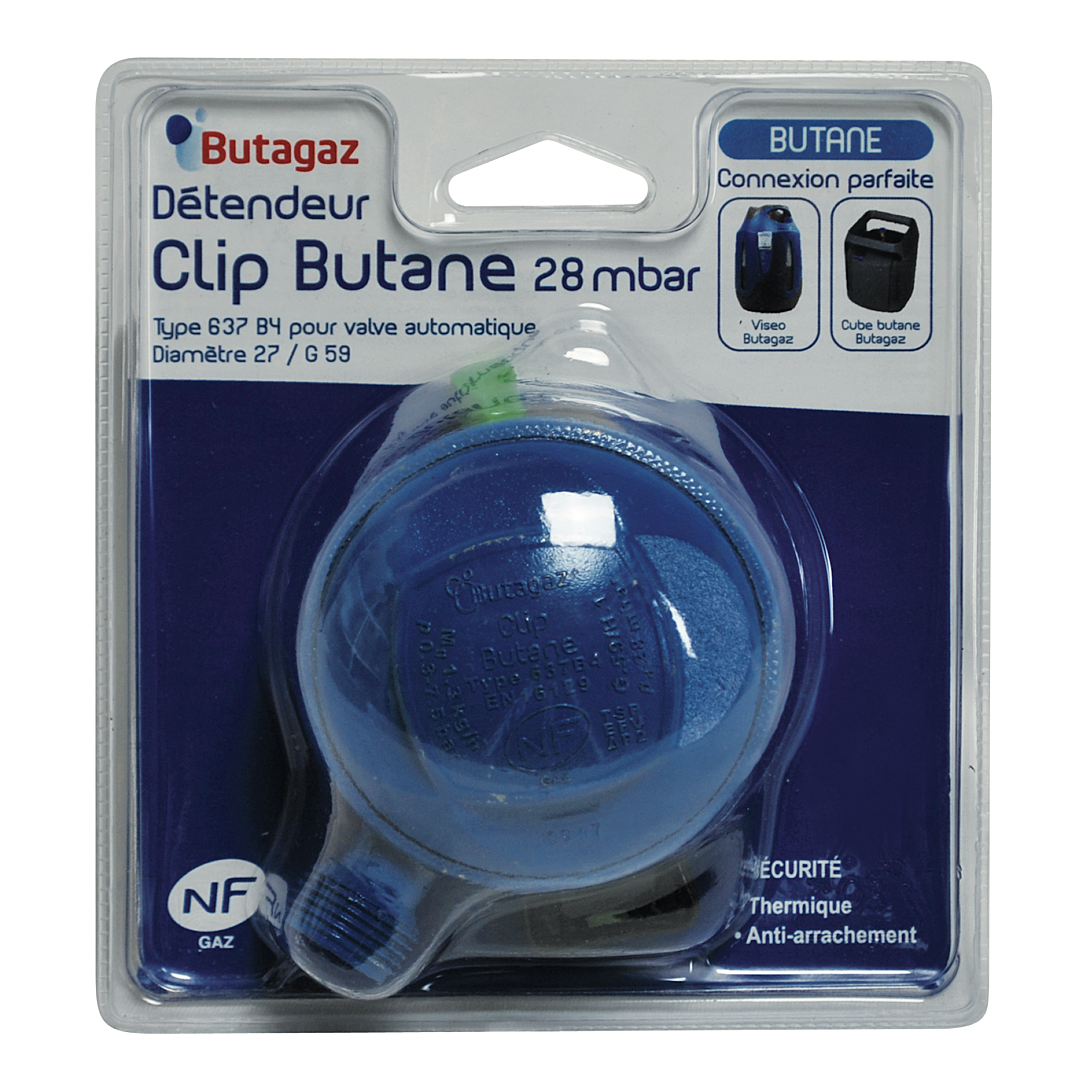 Détendeur butane 28mbar - 1,3kg/h diamètre 27mm compatible avec les bouteilles à clipser propane BUTAGAZ (cube, viseo)