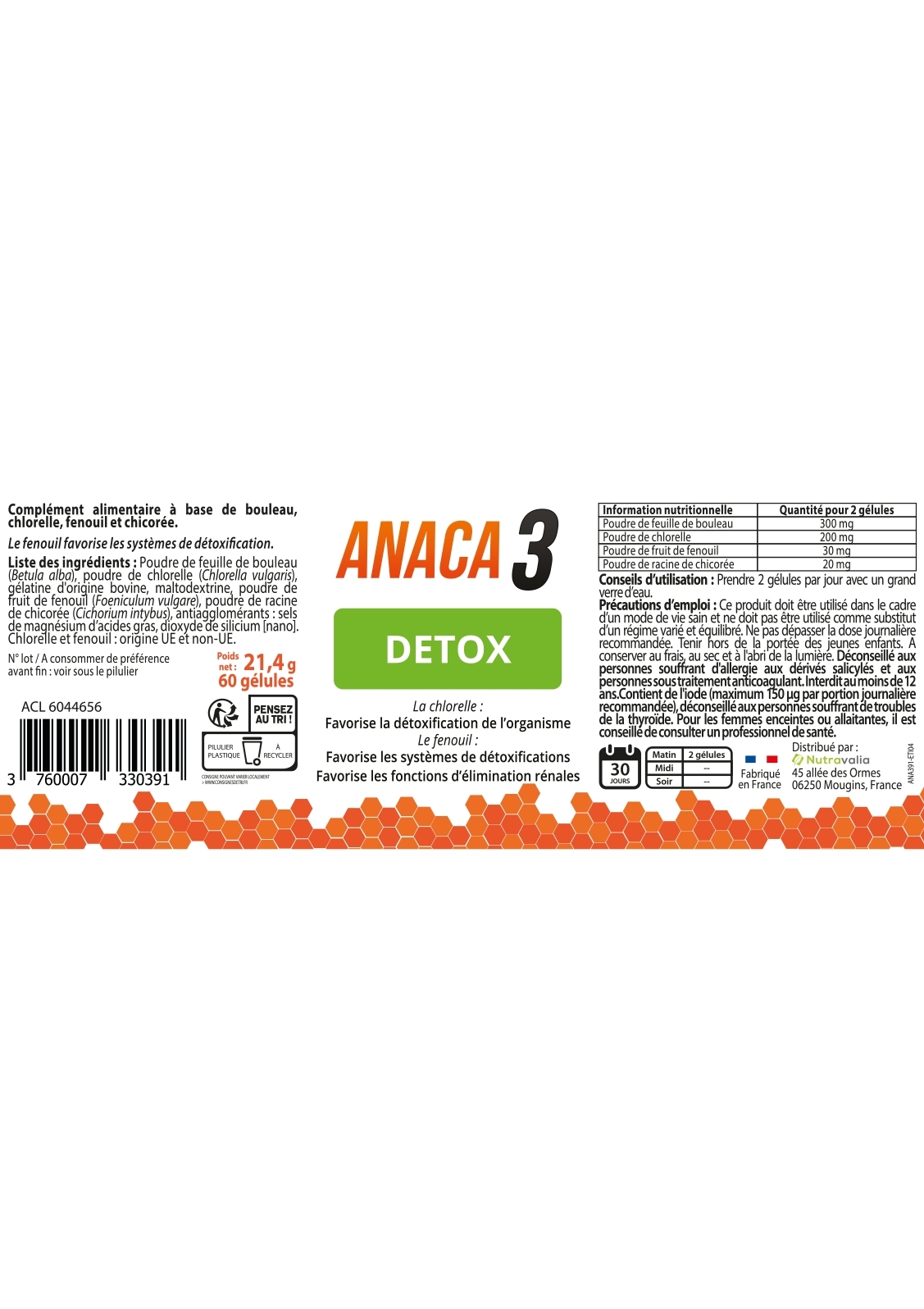 Anaca3 Detox 60 Gélules est un complément alimentaire composé de plusieurs plantes : bouleau, chlorelle, fenouil et chicorée conçu pour favoriser la détoxification de l'organisme. La chlorelle favorise la détoxification de l'organisme, aide à éliminer les métaux lourds, a une influence bénéfique sur le fonctionnement de la vésicule biliaire, du foie et des reins et sur les taux de sucre et cholestérol. Elle favorise et aide le métabolisme digestif. Le fenouil favorise les systèmes de détoxification, les fonctions d'élimination rénale et contribue au débit urinaire. Il favorise la fonction excrétoire des reins et l'élimination urinaire. Le bouleau contient des herbes favorisant l'activité du foie, des reins et du tractus intestinal et a une influence bénéfique sur la digestion et favorise le processus de détoxification de l'organisme. La chicorée participe aux programmes d'amincissement en complément d'un régime, contribue aux fonctions normales d'élimination urinaire et soutient les systèmes de détoxification. Elle contribue au débit urinaire, favorise l'élimination urinaire et les fonctions d'élimination rénale