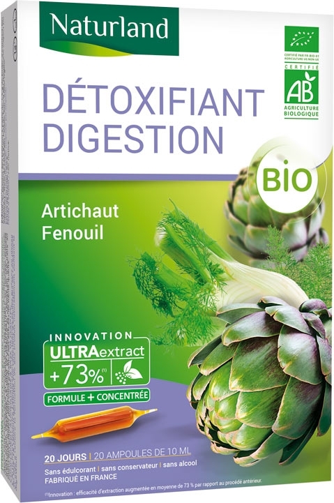 Naturland Détoxifiant Digestion Bio 20 Ampoules Buvables de 10 ml est un complément alimentaire certifié label Ultra Extract sous forme d'ampoule buvable à base de plantes biologiques. Ce complément alimentaire contient de l'Artichaut qui favorise l'élimination des toxines et des graisses au niveau du foie. Le Fenouil participe aux fonctions d'élimination de l'organisme et aide à réduire la formation de gaz produit naturellement pendant la digestion. Label Ultra Extract : un nouveau procédé d'extraction végétale. Il repose sur une méthode innovante alliant performance et écologie, permettant d'extraire au coeur des plantes pour vous garantir des extraits de haute qualité. Formulé sans édulcorants, sans conservateur, sans alcool.