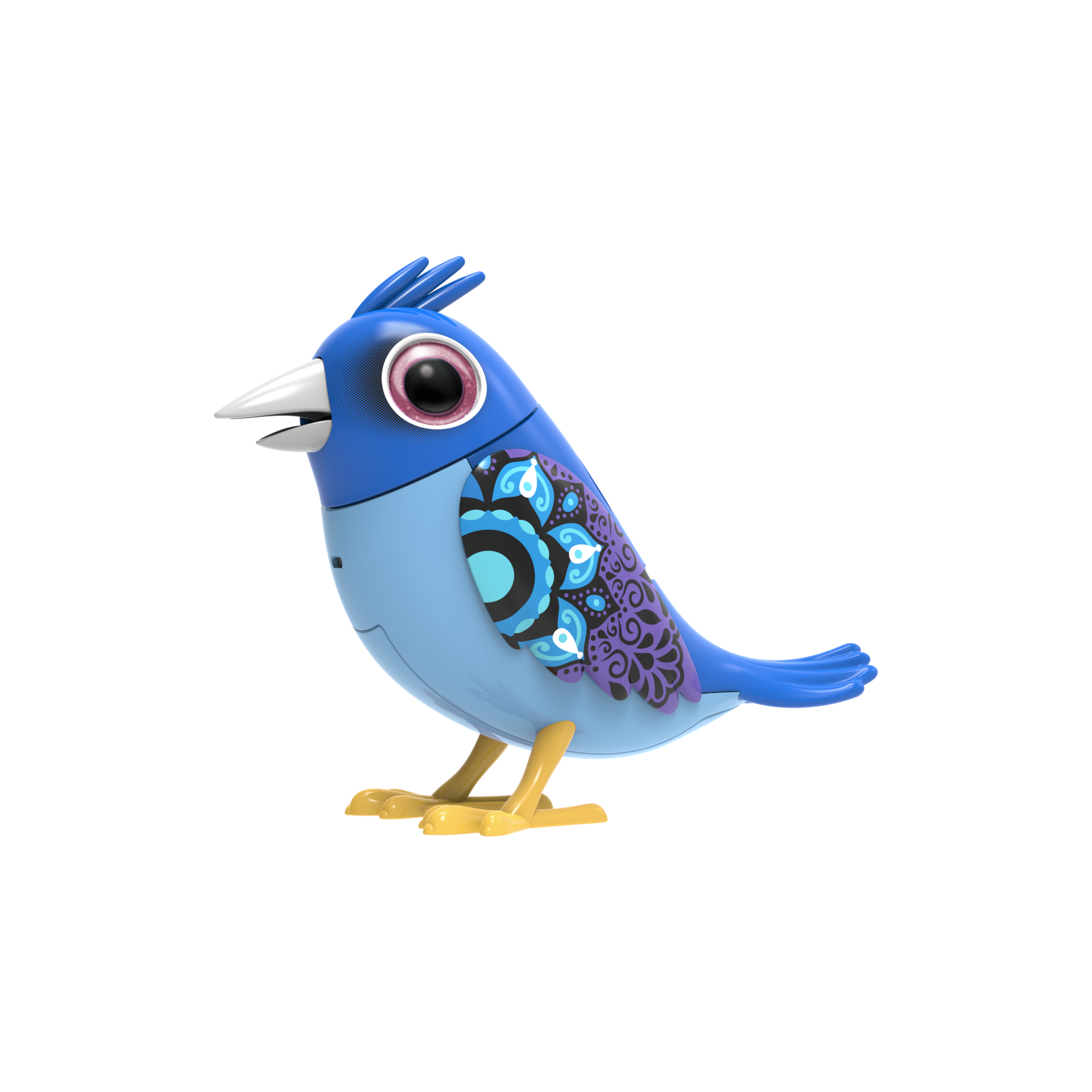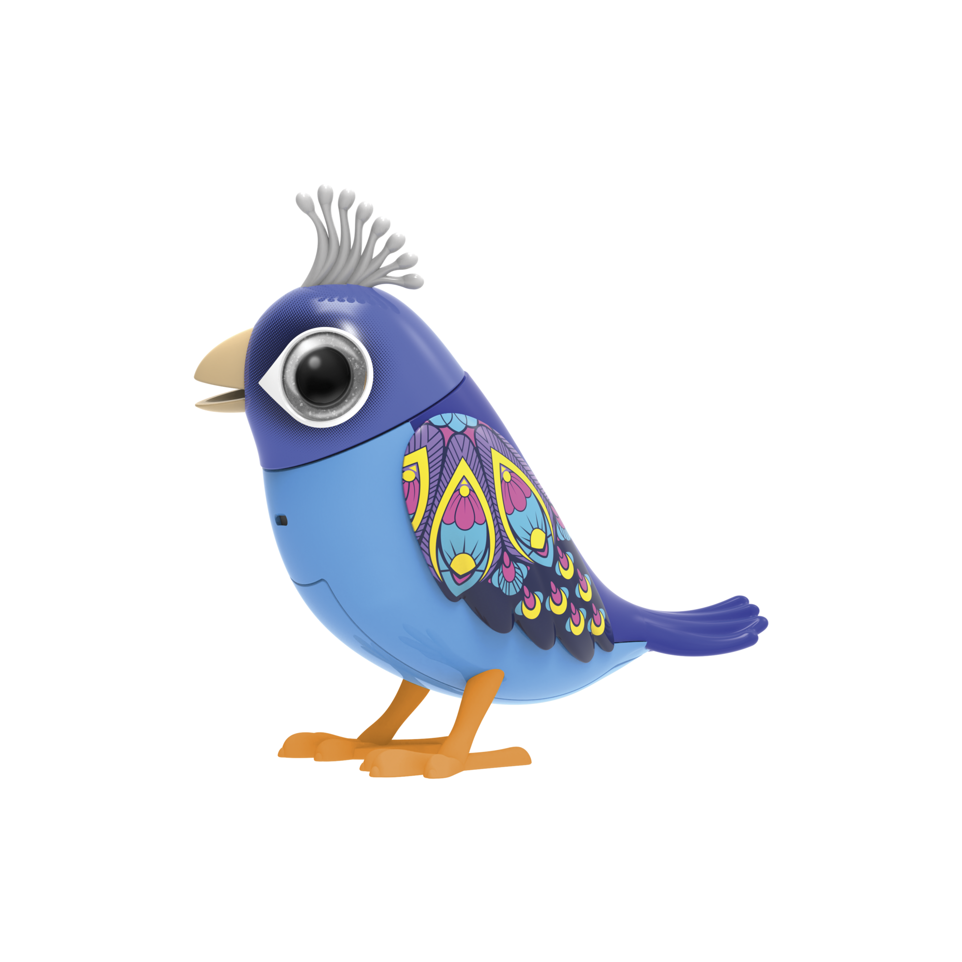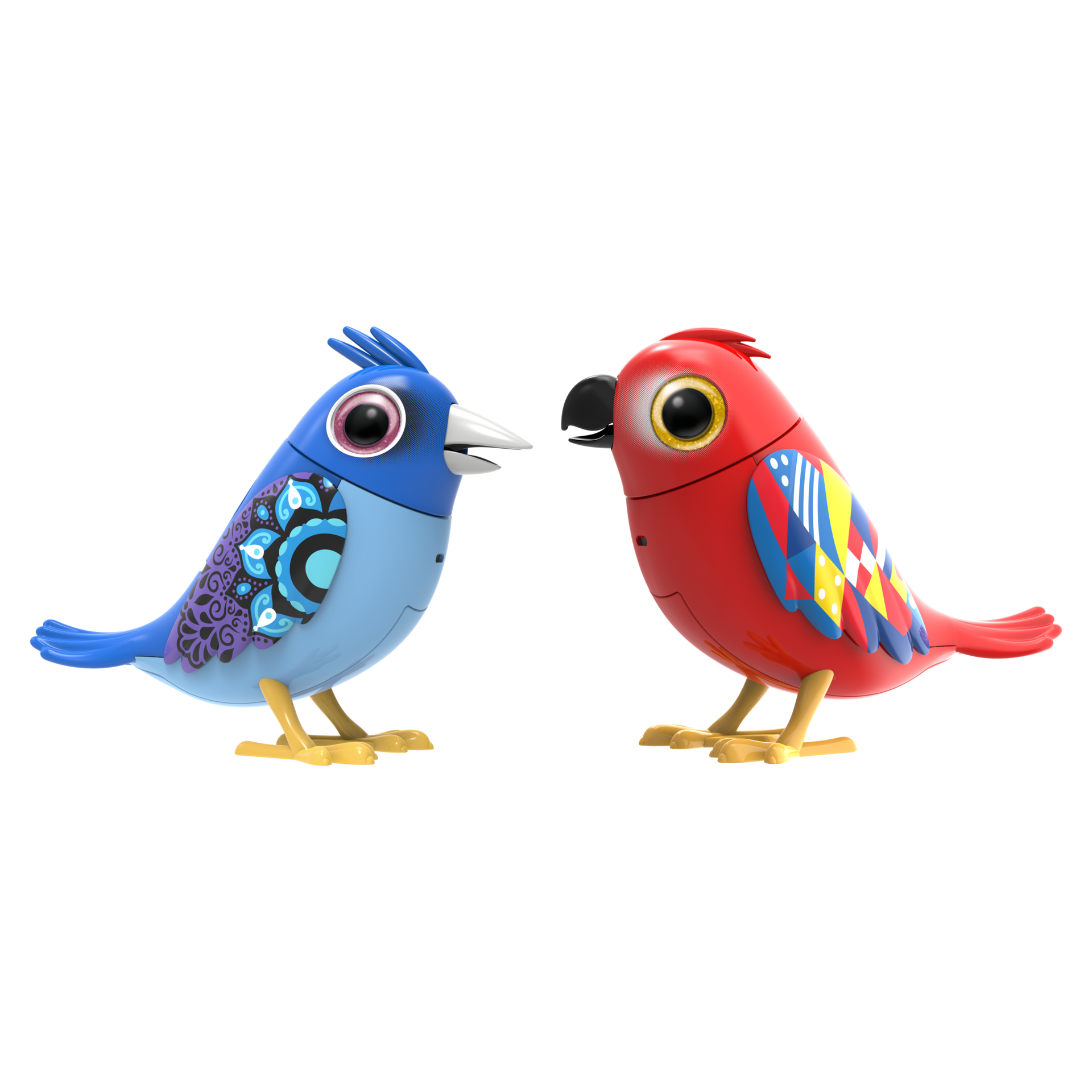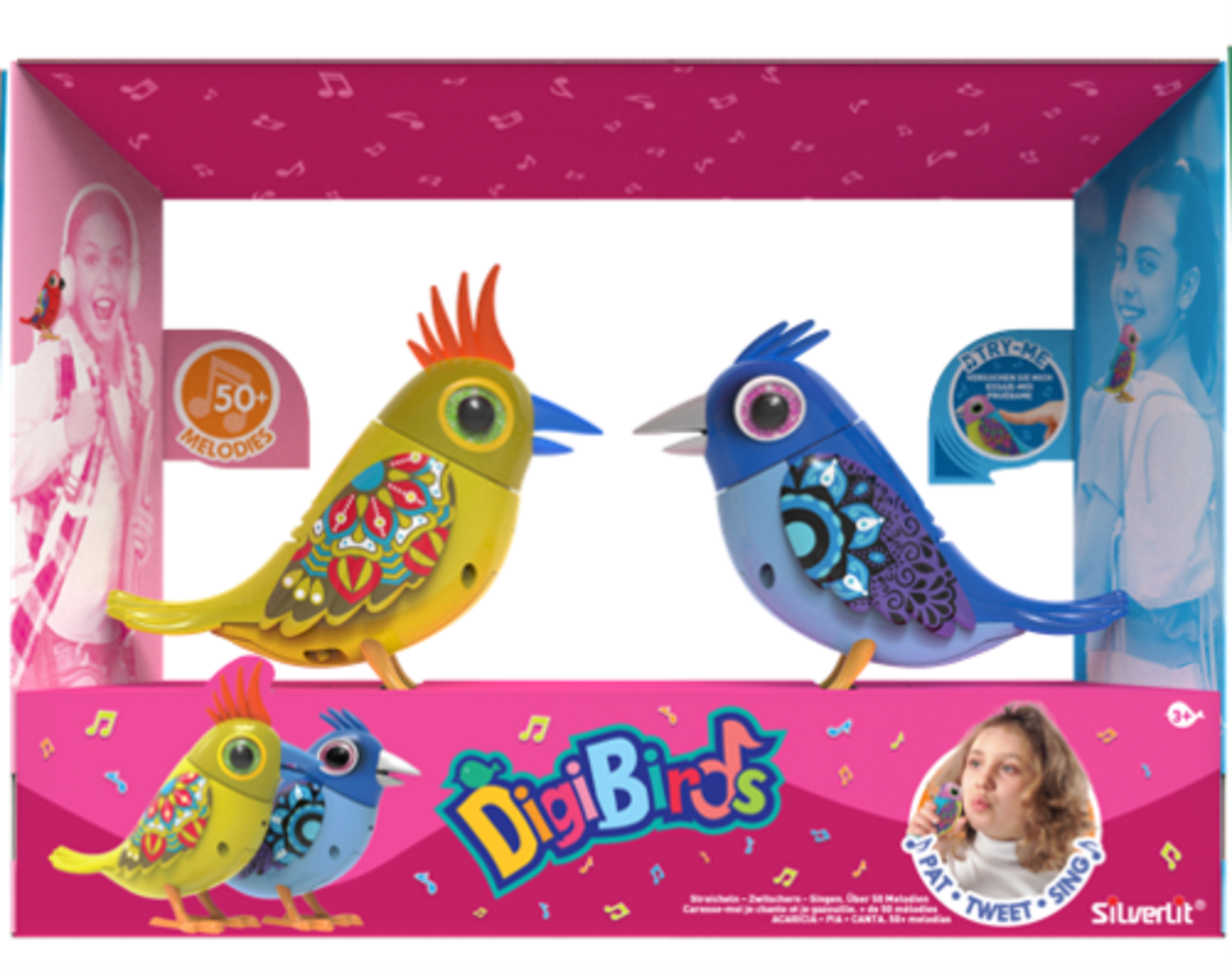 DIGIBIRDS -Ces oiseaux intéractifs au look coloré sifflent et chantent jusqu'à 60 comptines connues de vos enfants. Il réagissent aux caresses et à la voix en bougeant le bec et la tête. Ils répondent quand on leur parlent, et peuvent se connecter avec d'autres Digibirds pour former une chorale ! 4 modèles à collectionner. 8,5 cm, piles incluses. A partir de 5 ans.